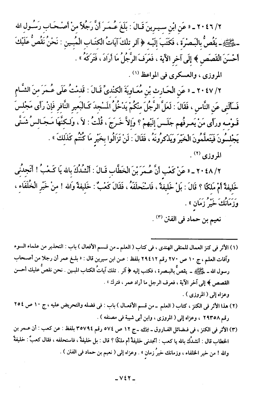 (¬2) هذا الأثر في الكنز، كتاب (العلم - من قسم الأفعال) باب: في فضله والتحريض عليه، جـ 10 ص 254 رقم 29358، وعزاه إلى (المروزى، وابن أَبى شيبة في مصنفه).