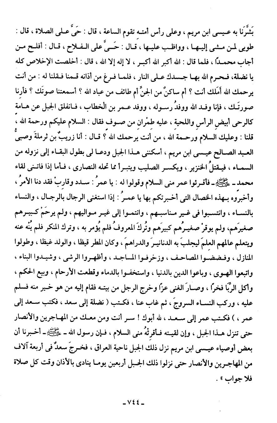 بَشَّرَنا به عيسى ابن مريم، وعلى رأس أمتهِ تقوم الساعة، قال: حَىَّ على الصلاة، قال: طوبى لمن مشى إليها، وواظب عليها، قال: حَىَّ على الفلاح، قال: أفلح من أجاب محمدًا، فلما قال: اللَّه أكبر اللَّه أكبر، لا إله إلا اللَّه، قال: أخلصت الإخلاص كله يا نضلة، فحرم اللَّه بها جسدك على النار، فلما فرغ من أذانه قمنا فقلنا له: من أنت يرحمك اللَّه أملك أنت؟ أم ساكنٌ من الجنِّ أم طائف من عباد اللَّه؟ أسمعتنا صوتَك؟ فأرنا صورتَك، فإنا وفد اللَّه ووفدُ رسوله، ووفد عمر بن الخطاب، فانفلق الجبل عن هامةٍ كالرحا أبيضِ الرأسِ واللحيةِ، عليه طِمْرانِ من صوفٍ فقال: السلام عليكم ورحمة اللَّه، قلنا: وعليك السلام ورحمة اللَّه، من أنت يرحمك اللَّه؟ قال: أنا زريبٌ بن ثرملةَ وصبىُّ العبد الصالح عيسى ابن مريم، أسكننى هذا الجبل ودعا لى بطول البقاء إلى نزوله من السماء، فيقتلُ الخنزير، ويكسر الصليب ويتبرأ مما تحله النصارى، فأما إذ فاتنى لقاء محمدٍ -صلى اللَّه عليه وسلم- فأقرئوا عمر منى السلام وقولوا له: يا عمرُ: سدد وقارِبْ فقد دنا الأمرُ، وأخبروه بهذه الخصال التى أخبرتكم بها يا عمرُ: إذا استغنى الرجال بالرجال، والنساء بالنساء، وانتسبوا من غير مناسبهم، وانتموا إلى غير مواليهم، ولم يرحَمْ كبيرهم صغيرَهم، ولم يوقرْ صغيرُهم كبيرَهم وتُركَ المعروفُ فلم يُؤمر به، وترك المنكر فلم يُنْه عنه وتعلم عالمهم العِلمَ ليجلبَ به الدنانيرَ والدراهمَ، وكان المطر قيظا، والولد غيظا، وطولوا المنازل، وفضضوا المصاحف، وزخرفوا المساجد، وأظهروا الرشى، وشيدوا البناء، واتبعوا الهوى، وباعوا الدين بالدنيا، واستخفوا بالدماء وقطعت الأرحام، وبيع الحكم، وأكل الرِّبَا فخرًا، وصارَ الغنى عزًا وخرج الرجل من بيته فقام إليه من هو خير منه فسلم عليه، وركب النساء السروجَ، ثم غاب عنا، فكتب (نضلة إلى سعد، فكتب سعد إلى عمر)، فكتب عمر إلى سعد: للَّه أبوك! سر أنت ومن معك من المهاجرين والأنصار حتى تنزل هذا الجبل، فإن لقيته فأقرِئْهُ منى السلام، فإن رسول اللَّه -صلى اللَّه عليه وسلم- أخبرنا أن بعض أوصياء عيسى ابن مريم نزل ذلك الجبل ناحية العراق فخرجَ سعدٌ في أربعة آلاف من المهاجرين والأنصار حتى نزلوا ذلك الجبل أربعين يوما ينادى بالأذان وقت كل صلاة فلا جواب".