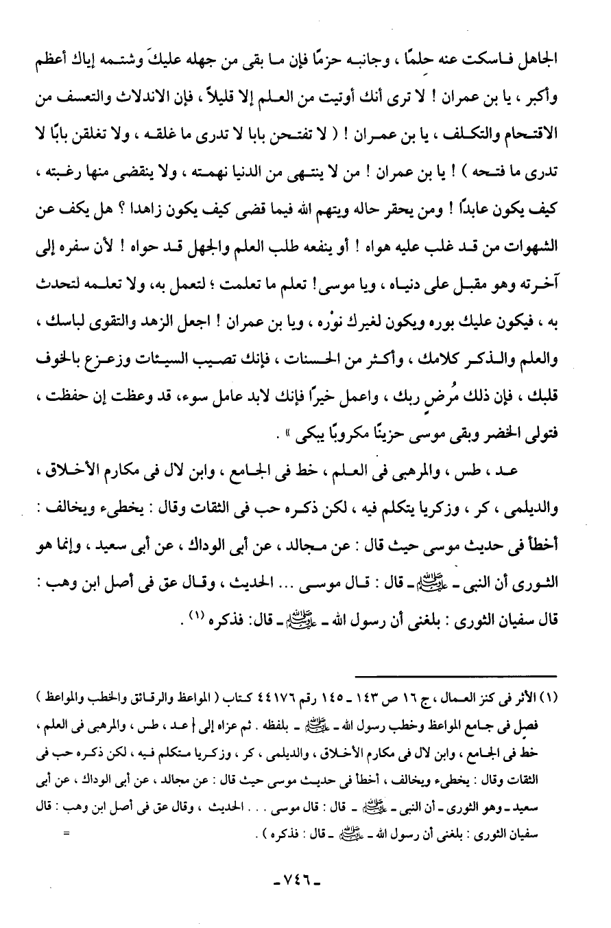 (¬1) الأثر في كنز العمال، جـ 16 ص 143 - 145 رقم 44176 كتاب (المواعظ والرقائق والخطب والمواعظ) فصل في جامع المواعظ وخطب رسول اللَّه -صلى اللَّه عليه وسلم- بلفظه. ثم عزاه إلى [عد، طس، والمرهبى في العلم، خط في الجامع، وابن لال في مكارم الأخلاق، والديلمى، كر، وزكريا متكلم فيه، لكن ذكره حب في الثقات وقال: يخطئ ويخالف، أخطأ في حديث موسى حيت قال: عن مجالد، عن أَبى الوداك، عن أَبى سعيد -وهو الثورى- أن النبى -صلى اللَّه عليه وسلم- قال: قال موسى. . . الحديث، وقال عق في أصل ابن وهب: قال سفيان الثورى: بلغنى أن رسول اللَّه -صلى اللَّه عليه وسلم- قال: فذكره). =