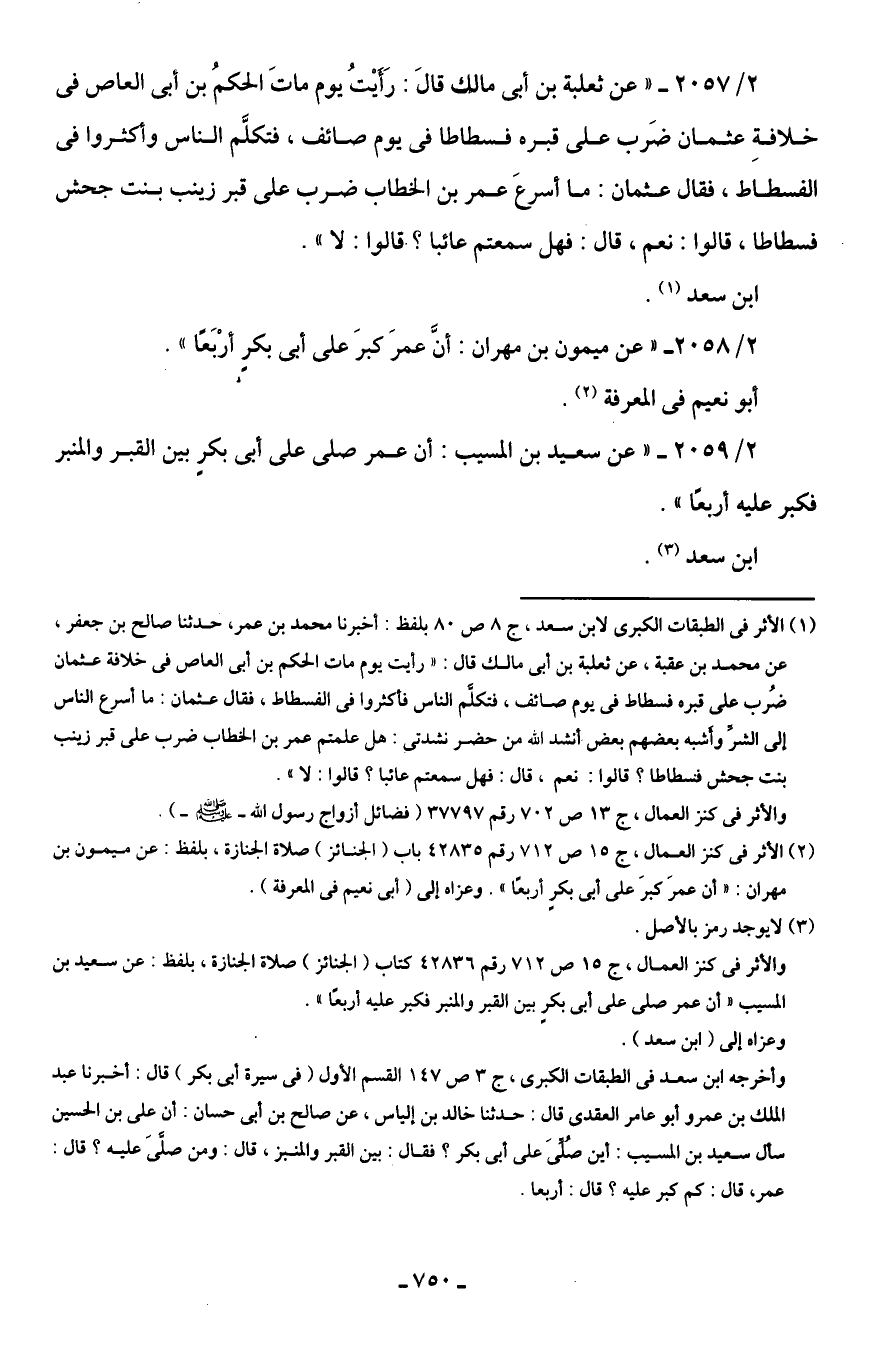 والأثر في كنز العمال، جـ 15 ص 712 رقم 42836 كتاب (الجنائز) صلاة الجنازة، بلفظ: عن سعيد بن المسيب "أن عمر صلى على أَبى بكرٍ بين القبر والمنبر فكبر عليه أربعًا".