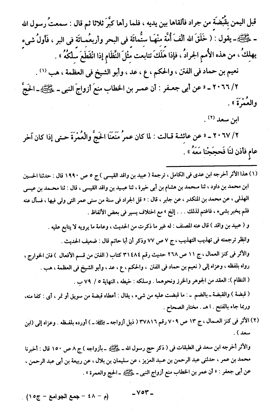 2/ 2066 - "عن أَبى جعفر: أن عمر بن الخطاب منعَ أزواجَ النبى -صلى اللَّه عليه وسلم- الحَجَّ والعُمْرَةَ".