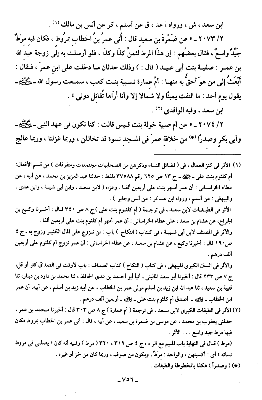 2/ 2073 - "عن ضَمْرةَ بن سعيدٍ قال: أُتى عمرُ بنُ الخطاب بمرُوطٍ، فكان فيه مِرْطٌ جيِّدٌ واسعٌ، فقال بعضُهم: إن هَذَا المرط لثمنُ كذَا وكذَا، فلو أرسلتَ به إلى زوجة عبَدِ اللَّه بن عمر: صفية بنت أَبى عبيد (قال: ) وذلك حدثان ما دخلت على ابنِ عمرَ، فقال: أَبْعَثُ إلى من هوَ أحقُّ به منها: أمِّ عِمارة نسيبة بنت كعب، سمعت رسول اللَّه -صلى اللَّه عليه وسلم- يقول يوم أحد: ما التفت يمينًا ولا شمالا إلا وأنا أَرَاها تُقاتِل دونى".