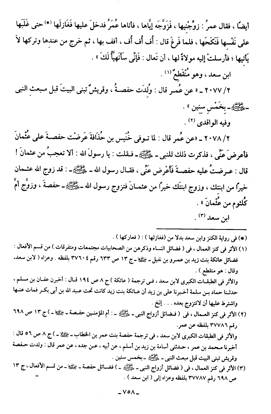 (¬2) الأثر في كنز العمال، في (فضائل أزواج النبى -صلى اللَّه عليه وسلم-: أم المؤمنين حفصة -رضي اللَّه عنها-) جـ 13 ص 698 رقم 37786 بلفظه عن عمر.