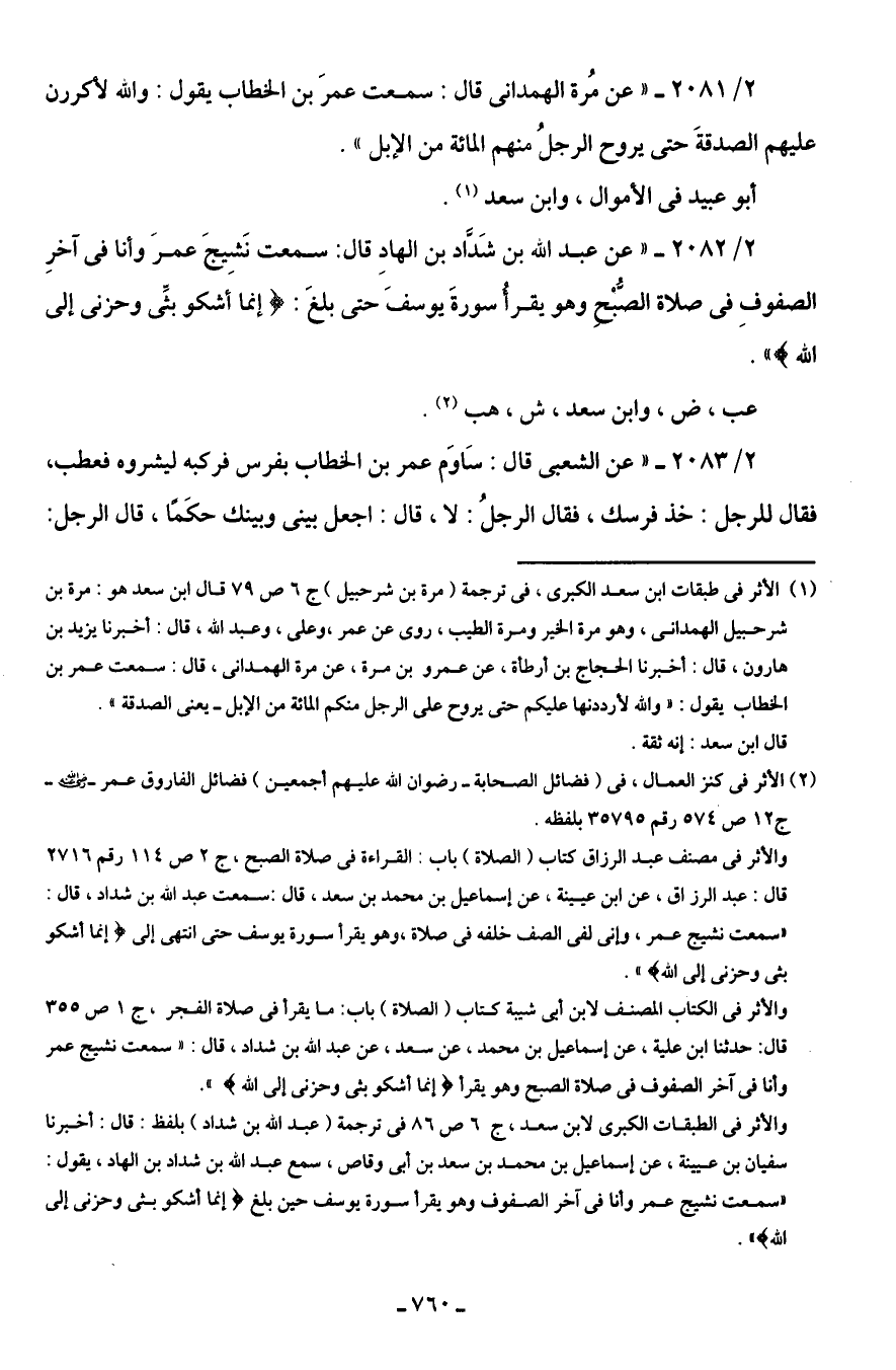 2/ 2081 - "عن مُرة الهمدانى قال: سمعت عمرَ بن الخطاب يقول: واللَّه لأكررن عليهم الصدقةَ حتى يروح الرجلُ منهم المائة من الإبل".