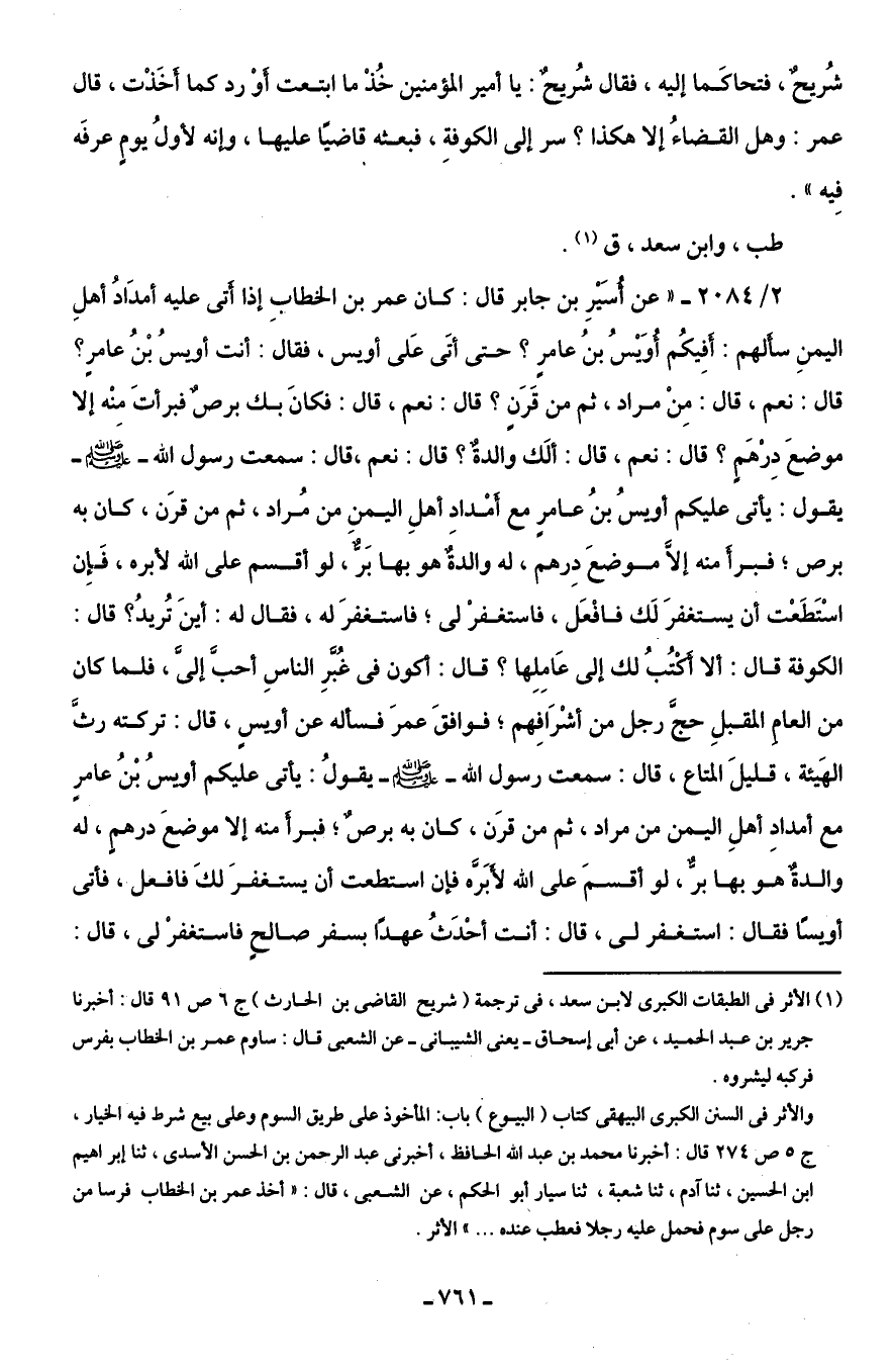 2/ 2084 - "عن أُسَبْرِ بن جابر قال: كان عمر بن الخطابِ إذا أَتى عليه أمدَادُ أَهْلِ اليمنِ سألهم: أفِيكُم أُوَيْسُ بنُ عامرٍ؟ حتى أتَى عَلى أويس، فقال: أنت أويسُ بْنُ عامرٍ؟ قال: نعم، قال: مِنْ مراد، ثم من قَرَنٍ؟ قال: نعم، قال: فكانَ بك برصٌ فبرأتَ مِنْه إلا موضعَ دِرْهَمٍ؟ قال: نعم، قال: ألَك والدةٌ؟ قال: نعم، قال: سمعت رسول اللَّه -صلى اللَّه عليه وسلم- يقول: يأتى عليكم أويسُ بنُ عامرٍ مع أَمْدادِ أَهْلِ اليمن من مُراد، ثم من قرَن، كان به برص؛ فبرأَ منه إلَّا موضعَ دِرهم، له والدةٌ هو بها بَرٌّ، لو أقسم على اللَّه لأبره، فَإِن اسْتَطَعْت أن يستغفرَ لَك فافْعَل، فاستغفرْ لى؛ فاستغفرَ له، فقال له: أينَ تُريدُ؟ قال: الكوفة قال: ألا أَكْتُبُ لك إلى عَامِلِها؟ قال: أكون في غُبَّرِ النَّاسِ أحبَّ إلىَّ، فلما كان من العام المقبلِ حجَّ رجل من أشْرَافِهم؛ فوافقَ عمرَ فسأله عن أويسٍ، قال: تركته رثَّ الهَيئة، قليلَ المتاع، قال: سمعت رسول اللَّه -صلى اللَّه عليه وسلم- يقولُ: يأتى عليكم أويسُ بْنُ عامرٍ مع أمدادِ أَهْلِ اليمن من مراد، ثم من قرَن، كان به برصٌ؛ فبرأ منه إلا موضعَ درهمٍ، له والدةٌ هو بها برٌّ، لو أقسمَ على اللَّه لأَبَرَّه فإن استطعت أن يستغفرَ لكَ فافعل، فأتى أويسًا فقال: استغفر لى، قال: أنت أحْدَثُ عهدًا بسفر صالحٍ فاستغفرْ لى، قال: