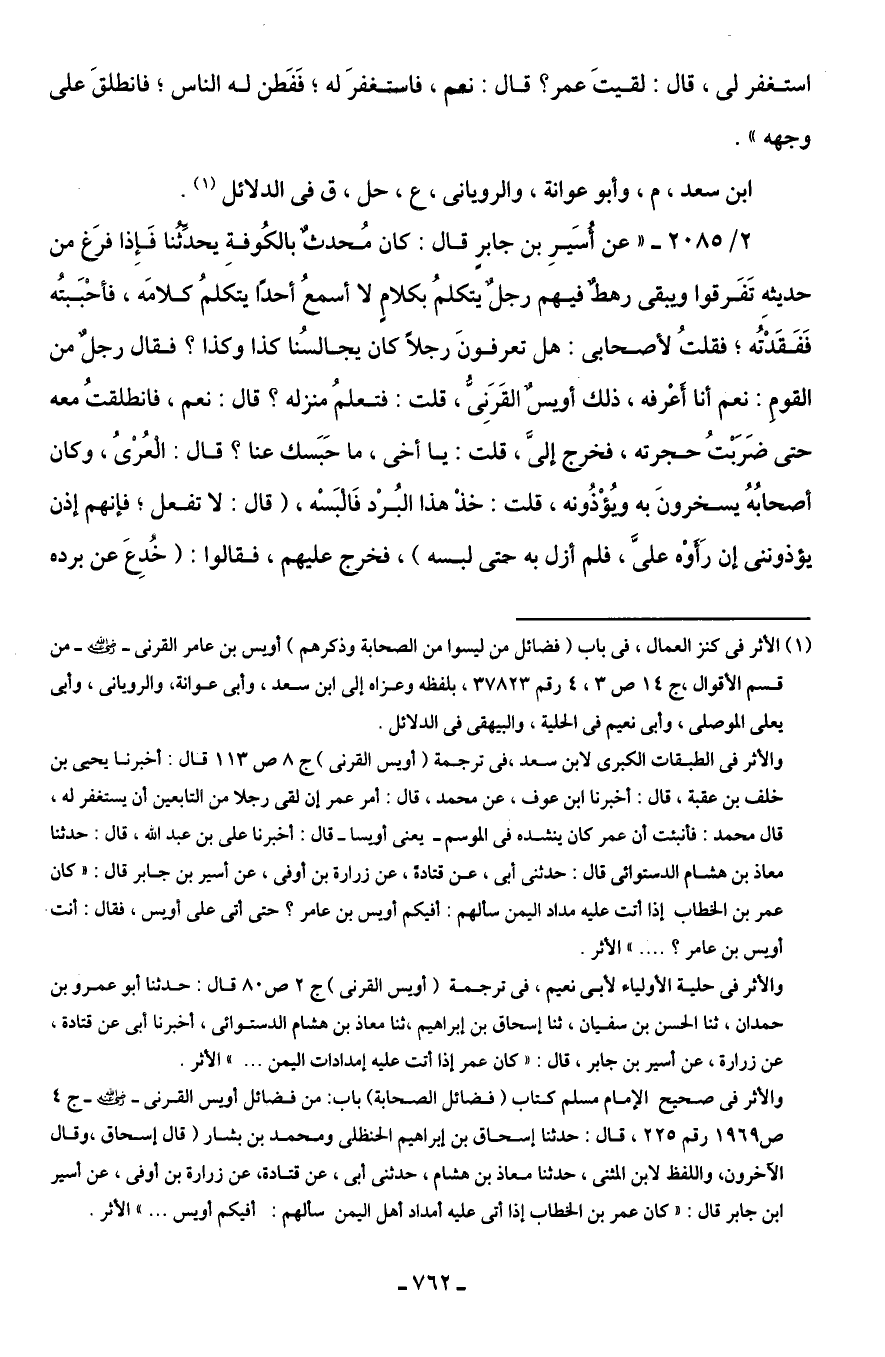 2/ 2085 - "عن أسَيرِ بن جابر قال: كان مُحدثٌ بالكُوفةِ يحدِّثُنا فَإِذا فرغَ من حديثهِ تَفَرقوا ويبقى رهطٌ فيهم رجلٌ يتكلمُ بكلامٍ لا أسمعُ أحدًا يتكلمُ كلامَه، فأحبَبته فَفَقَدْتُه؛ فقلتُ لأصحابى: هل تعرفونَ رجلًا كان يجالسُنا كذا وكذا؟ فقال رجلٌ من القومِ: نعم أنا أَعْرفه، ذلك أويسٌ القَرَنِىُّ، قلت: فتعلمُ منزله؟ قال: نعم، فانطلقتُ معه حتى ضَرَبْتُ حجرته، فخرج إلىَّ، قلت: يا أخى، ما حَبَسك عنا؟ قال: الْعُرْىُ، وكان أصحابُهُ يسخرونَ به ويُؤْذُونه، قلت: خُذْ هذا البُرْد فَالْبَسْه، (قال: لا تفعل؛ فإنهم إذن يؤذوننى إن رَأَوْه علىَّ، فلم أزل به حتى لبسه)، فخرج عليهم، فقالوا: (خُدِعَ عن برده
