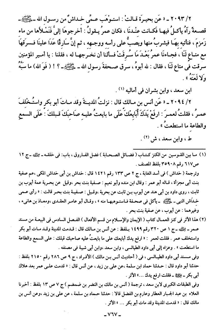 2/ 2094 - "عَن أنس بن مالكٍ قال: نزلتُ المدينةَ وقد ماتَ أبو بكرٍ واستُخْلِفَ عمرُ، فقلتُ لعمرَ: ارفَعْ يَدَكَ أُبَايعْك عَلَى ما بايعتُ عليهِ صَاحبَكَ قبلكَ: عَلَى السمعِ والطاعةِ ما استطعتُ".