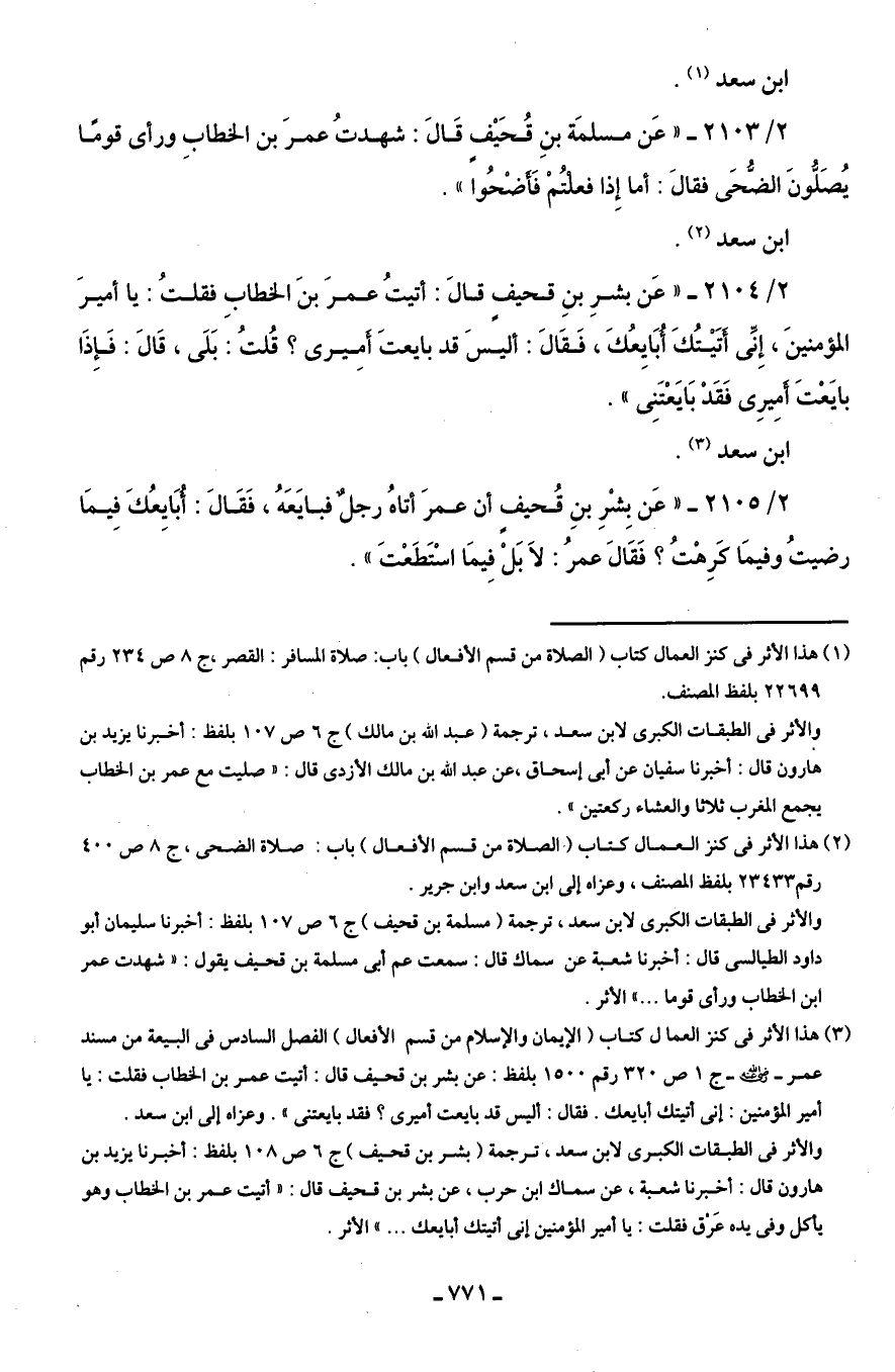 2/ 2103 - "عَن مسلمَة بنِ قُحَيْفٍ قَالَ: شهدتُ عمرَ بن الخطابِ ورأى قومًا يُصَلُّونَ الضُّحَى فقالَ: أما إِذا فعلتُمْ فَأضْحُوا".