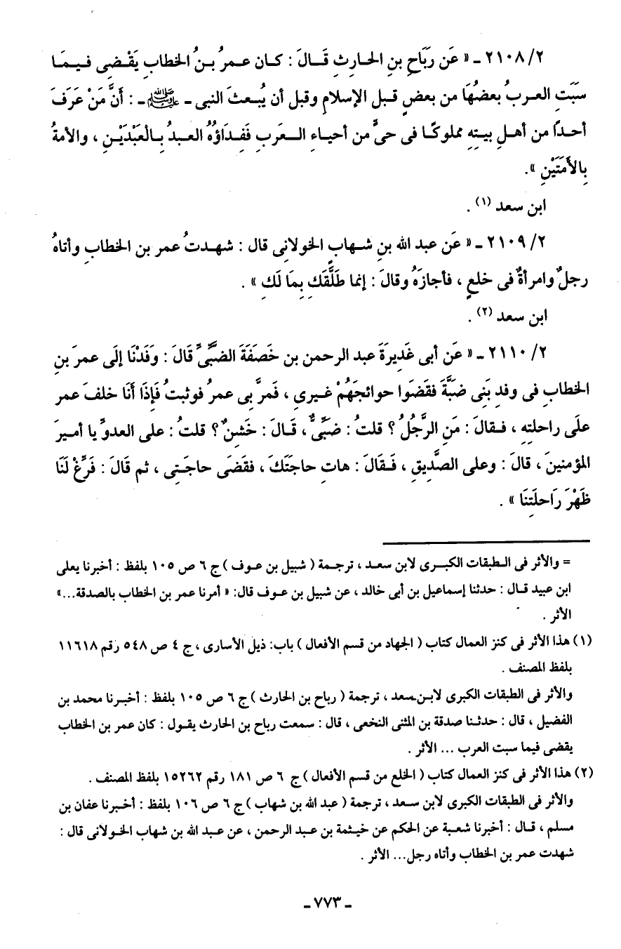 2/ 2108 - "عَن رَبَاحِ بنِ الحارِثِ قَالَ: كان عمرُ بنُ الخطابِ يَقْضِى فيمَا سَبَت العربُ بعضُهَا من بعضٍ قبل الإسلام وقبل أن يُبعثَ النبى -صلى اللَّه عليه وسلم-: أَنَّ مَنْ عَرَفَ أحدًا من أَهْلِ بيتِهِ مملوكًا في حىٍّ من أحياءِ العَربِ فَفِدَاؤُهُ العبدُ بِالعَبْدَيْنِ، والأمةُ بِالأَمَتَيْنِ".