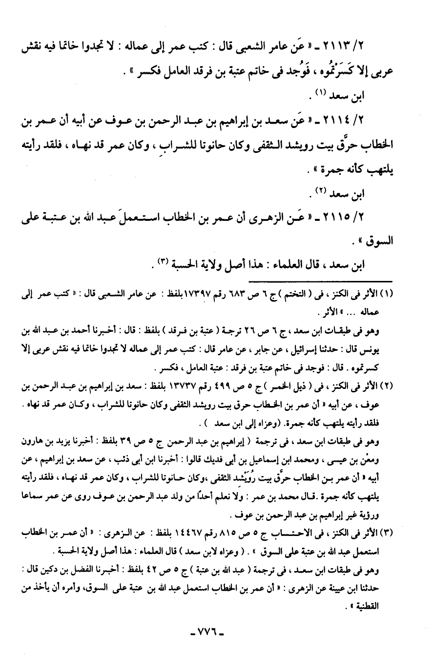 (¬3) الأثر في الكنز، في الاحتساب جـ 5 ص 815 رقم 14467 بلفظ: عن الزهرى: "أن عمر بن الخطاب استعمل عبد اللَّه بن عتبة على السوق". (وعزاه لابن سعد) قال العلماء: هذا أصل ولاية الحسبة.