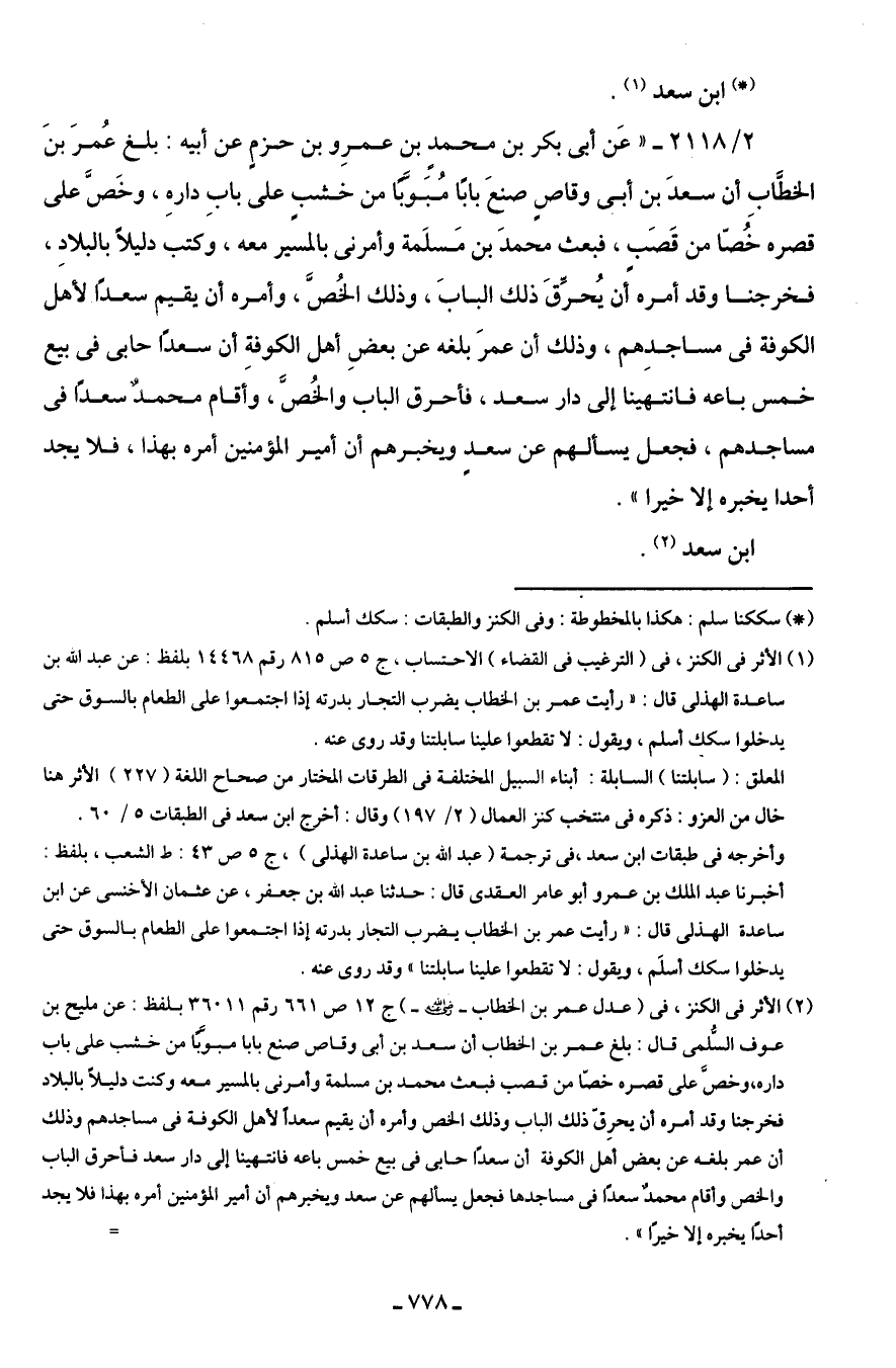 (¬2) الأثر في الكنز، في (عدل عمر بن الخطاب -رضي اللَّه عنه-) جـ 12 ص 661 رقم 36011 بلفظ: عن مليح بن عوف السُّلمى قال: بلغ عمر بن الخطاب أن سعد بن أَبى وقاص صنع بابا مبوَّبًا من خشب على باب داره، وخصَّ على قصره خصًّا من قصب فبعث محمد بن مسلمة وأمرنى بالمسير معه وكنت دليلًا بالبلاد فخرجنا وقد أمره أن يحرِقّ ذلك الباب وذلك الخص وأمره أن يقيم سعدًا لأهل الكوفة في مساجدهم وذلك أن عمر بلغه عن بعض أهل الكوفة أن سعدًا حابى في بيع خمس باعه فانتهينا إلى دار سعد فأحرق الباب والخص وأقام محمدٌ سعدًا في مساجدها فجعل يسألهم عن سعد ويخبرهم أن أمير المؤمنين أمره بهذا فلا يجد أحدًا يخبره إلا خيرًا". =