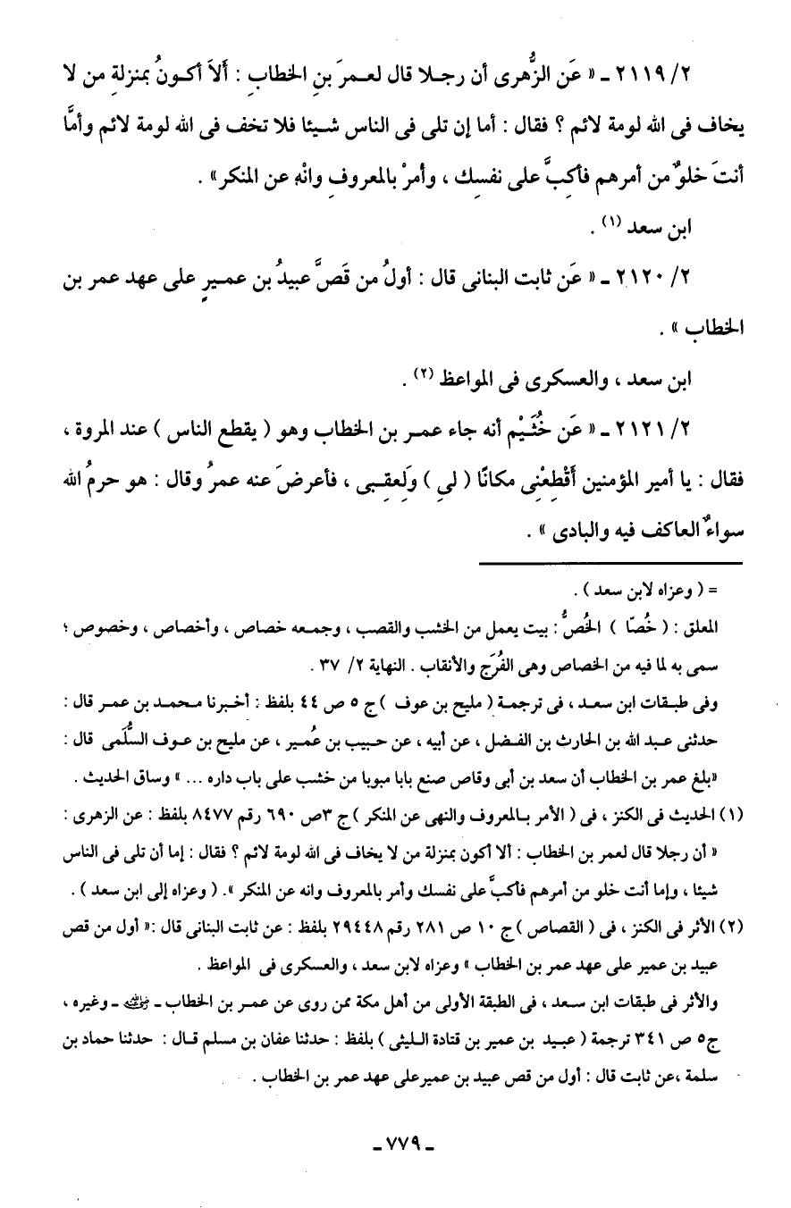 (¬2) الأثر في الكنز، في (القصاص) جـ 10 ص 281 رقم 29448 بلفظ: عن ثابت البنانى قال: "أول من قص عبيد بن عمير على عهد عمر بن الخطاب" وعزاه لابن سعد، والعسكرى في المواعظ.