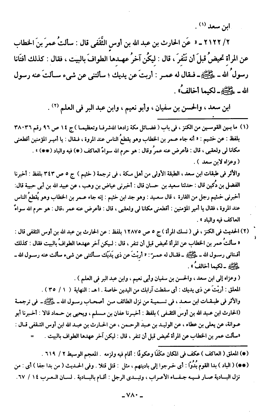 2/ 2122 - "عَن الحارث بن عبد اللَّه بن أوسٍ الثَّقَفى قال: سألتُ عمرَ بنَ الخطاب عن المرأةِ تحيضُ قبلَ أن تَنْفِرَ، قال: لِيكُن آخرُ عهدِها الطوافَ بالبيت، فقال: كذلك أفتَانا رسولُ اللَّه -صلى اللَّه عليه وسلم- فقال له عمر: أربتَ عن يديك؛ سألتنى عن شئ سألتَ عنه رسول اللَّه -صلى اللَّه عليه وسلم- لكيما أخالفُ".