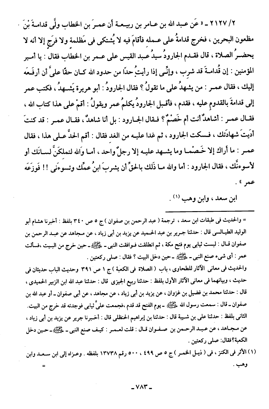 2/ 2127 - "عَن عبد اللَّه بن عامر بن ربيعة أَن عمرَ بن الخطاب ولَّى قدامةَ بْنَ مظعون البحرين، فخرج قدامةُ على عملهِ فأقامَ فيه لا يُشتكى في مَظلمةٍ ولا فَرجٍ إلا أنه لا يحضُر الصلاة، قال فقدم الجارودُ سيدُ عبد القيس على عمر بن الخطاب فقال: يا أمير المؤمنين: إن قُدامةَ قد شرِب، وإنِّى إذا رأيتُ حدًّا من حدود اللَّه كان حقًا علىَّ أن أرفَعَه إليك، فقال عمر: من يشهدُ على ما تقولُ؟ فقال الجارودُ: أبو هريرة يَشهدُ، فكتب عمر إلى قدامةَ بالقدومِ عليه، فقدم، فأقبل الجارودُ يكلمُ عمر ويقولُ: أقمْ على هذا كتاب اللَّه، فقال عمر: أشاهدٌ أنت أم خَصْمٌ؟ فقال الجارود: بل أنا شاهدٌ، فقال عمر: قد كنتَ أدَيتَ شهادَتك، فسكت الجارود، ثم غدا عليه من الغدِ فقال: أقم الحدَّ على هذا، فقال عمر: ما أراك إلا خَصْما وما يشهد عليه إلا رجلٌ واحد، أما وَاللَّه لتملِكَنَّ لسانَك أو لأسوءنَّك، فقال الجارود: أما واللَّه ما ذَلك بالحقِّ أن يشربَ ابنُ عمِّك وتسوءَنى! ! فَوزَعَه عمر".