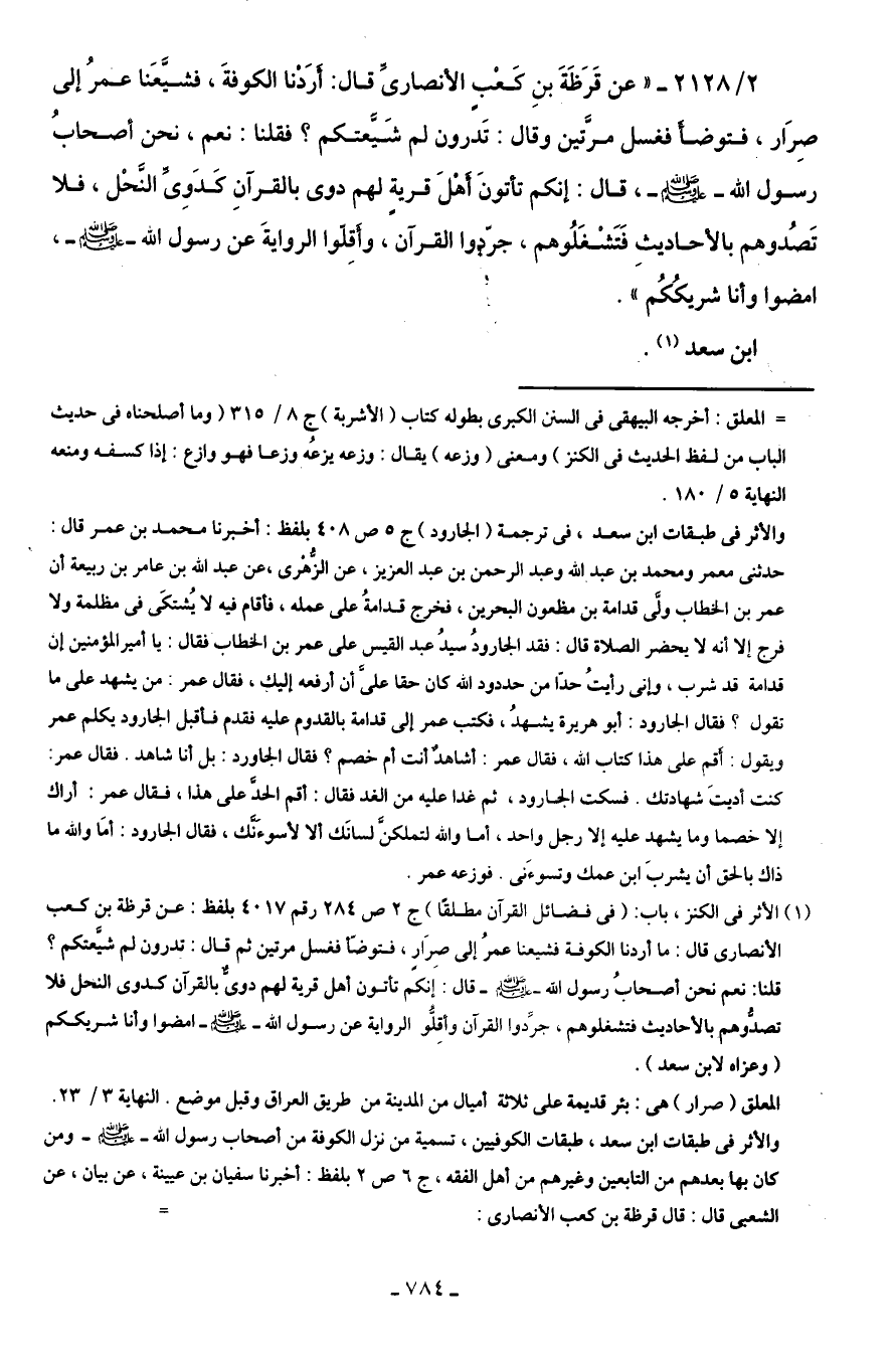 2/ 2128 - "عن قَرَظَةَ بنِ كَعْبٍ الأنصارىِّ قال: أرَدْنا الكوفةَ، فشيَّعَنا عمرُ إلى صِرَار، فتوضأَ فغسل مرَّتين وقال: تَدرون لم شَيَّعتكم؟ فقلنا: نعم، نحن أصحابُ رسول اللَّه -صلى اللَّه عليه وسلم-، قال: إنكم تأتونَ أَهْلَ قرية لهم دوى بالقرآنِ كَدَوِىِّ النَّحْل، فلا تَصُدوهم بالأحاديثِ فَتَشْغَلُوهم، جرّدوا القرآن، وأَقِلّوا الروايةَ عن رسول اللَّه -صلى اللَّه عليه وسلم-، امضوا وأنا شريكُكُم".