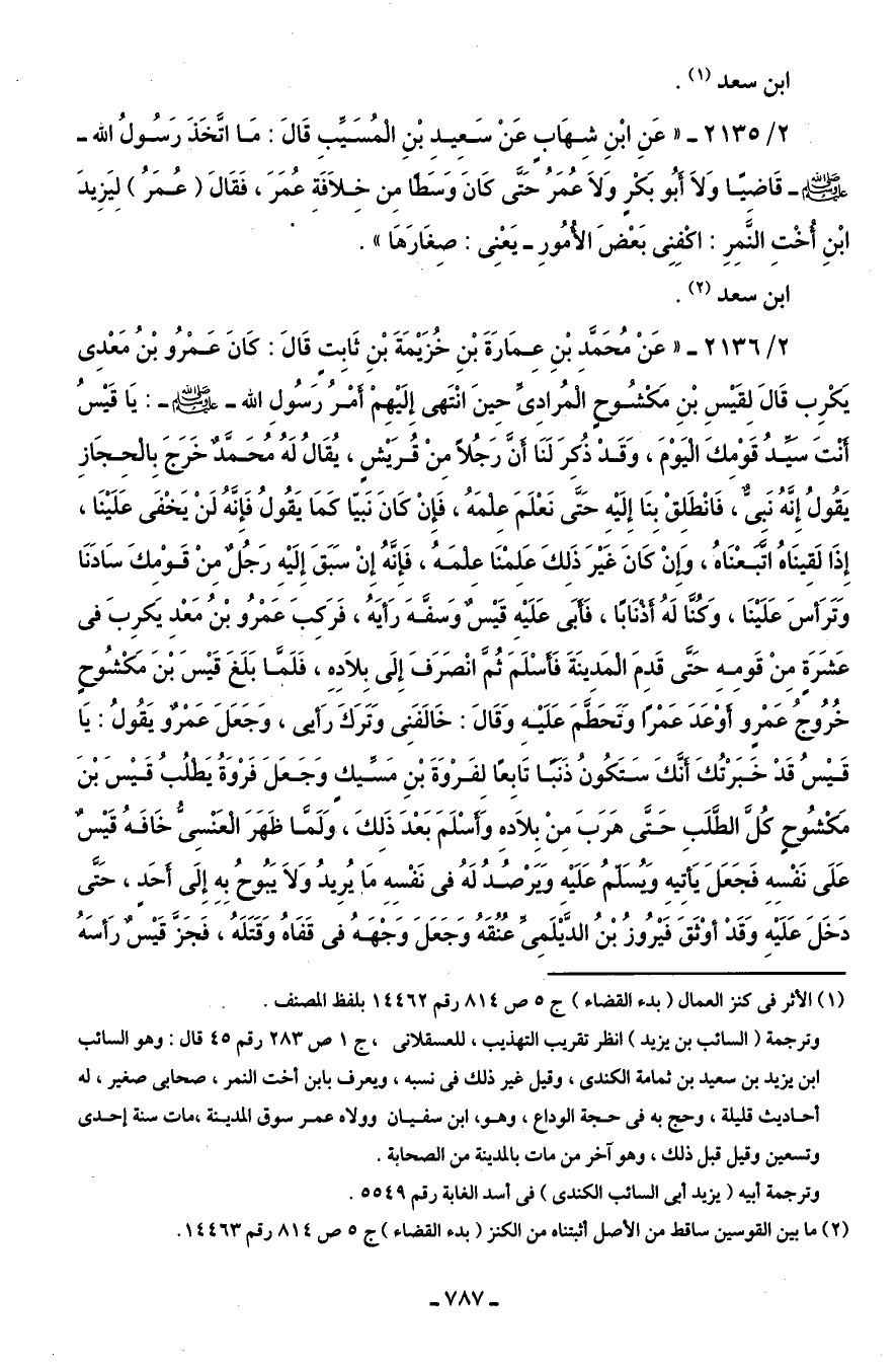 وترجمة (السائب بن يزيد) انظر تقريب التهذيب، للعسقلانى، جـ 1 ص 283 رقم 45 قال: وهو السائب ابن يزيد بن سعيد بن ثمامة الكندى، وقيل غير ذلك في نسبه، ويعرف بابن أخت النمر، صحابى صغير، له أحاديث قليلة، وحج به في حجة الوداع، وهو، ابن سفيان وولاه عمر سوق المدينة، مات سنة إحدى وتسعين وقيل قبل ذلك، وهو آخر من مات بالمدينة من الصحابة.