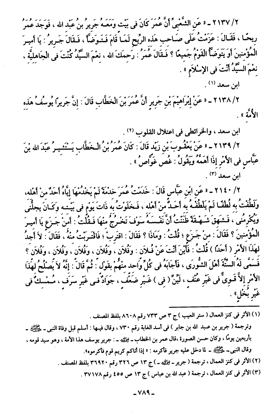 2/ 2138 - "عَنْ إِبْرَاهِيْمَ بْنِ جَرِيرِ أَنَّ عُمَرَ بْنَ الخَطَّابِ قَالَ: إِنَّ جَريرًا يُوسُفُ هَذِهِ الأُمَّةِ".