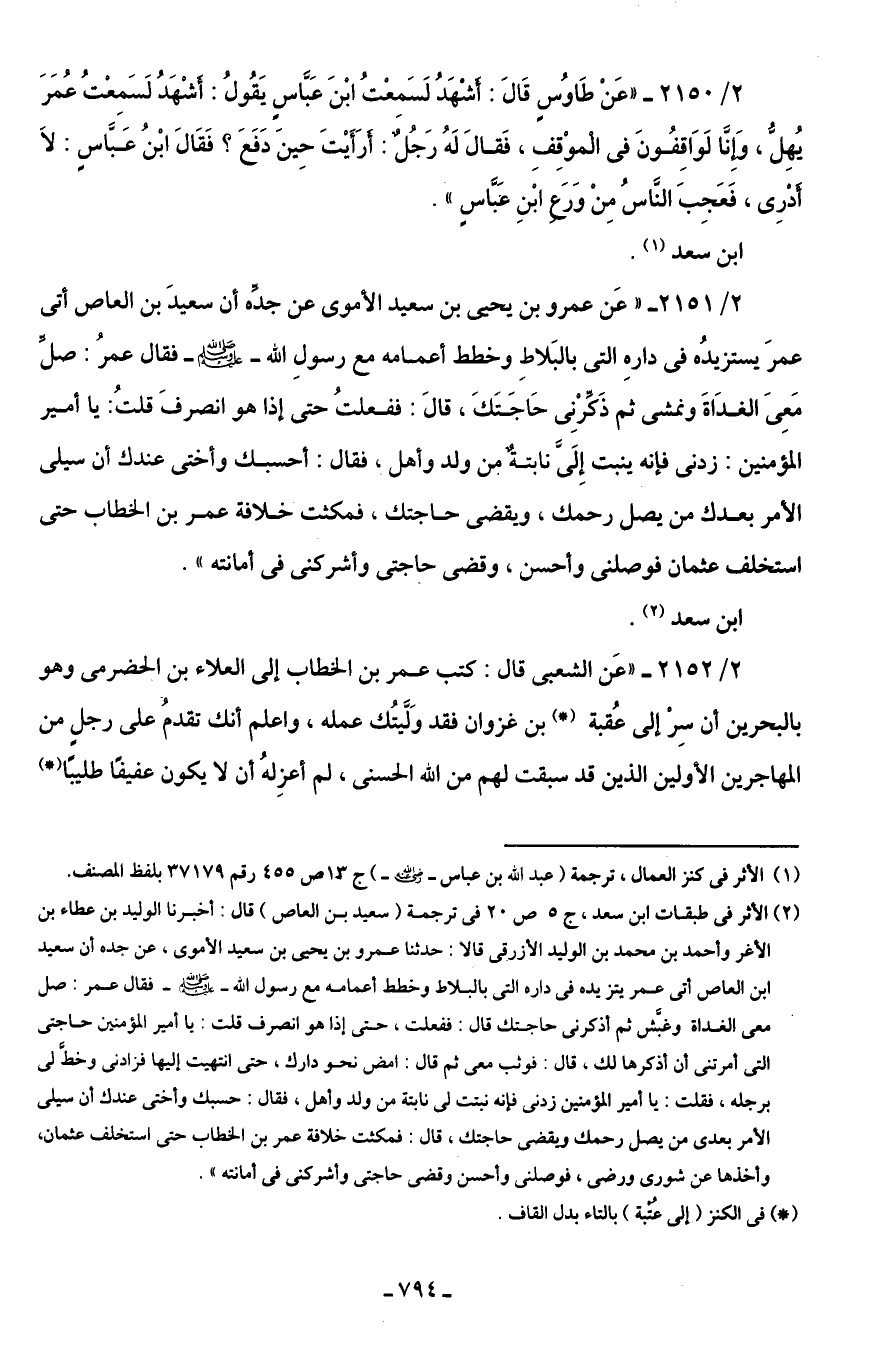 2/ 2152 - "عَن الشعبى قال: كتب عمر بن الخطاب إلى العلاء بن الحضرمى وهو بالبحرين أن سِرْ إلى عُقبة (*) بن غزوان فقد وَلَّيتُك عمله، واعلم أنك تقدمُ على رجلٍ من المهاجرين الأولين الذين قد سبقت لهم من اللَّه الحسنى، لم أعزِلهُ أن لا يكون عفيفًا طليبًا (*)