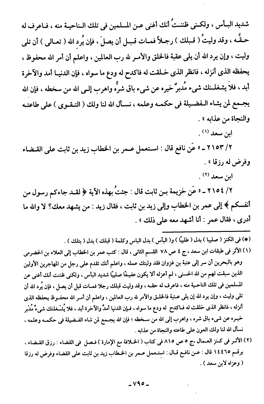 2/ 2153 - "عَن نافع قال: استعمل عمر بن الخطاب زيد بن ثابت على القضاء وفرض له رزقا".