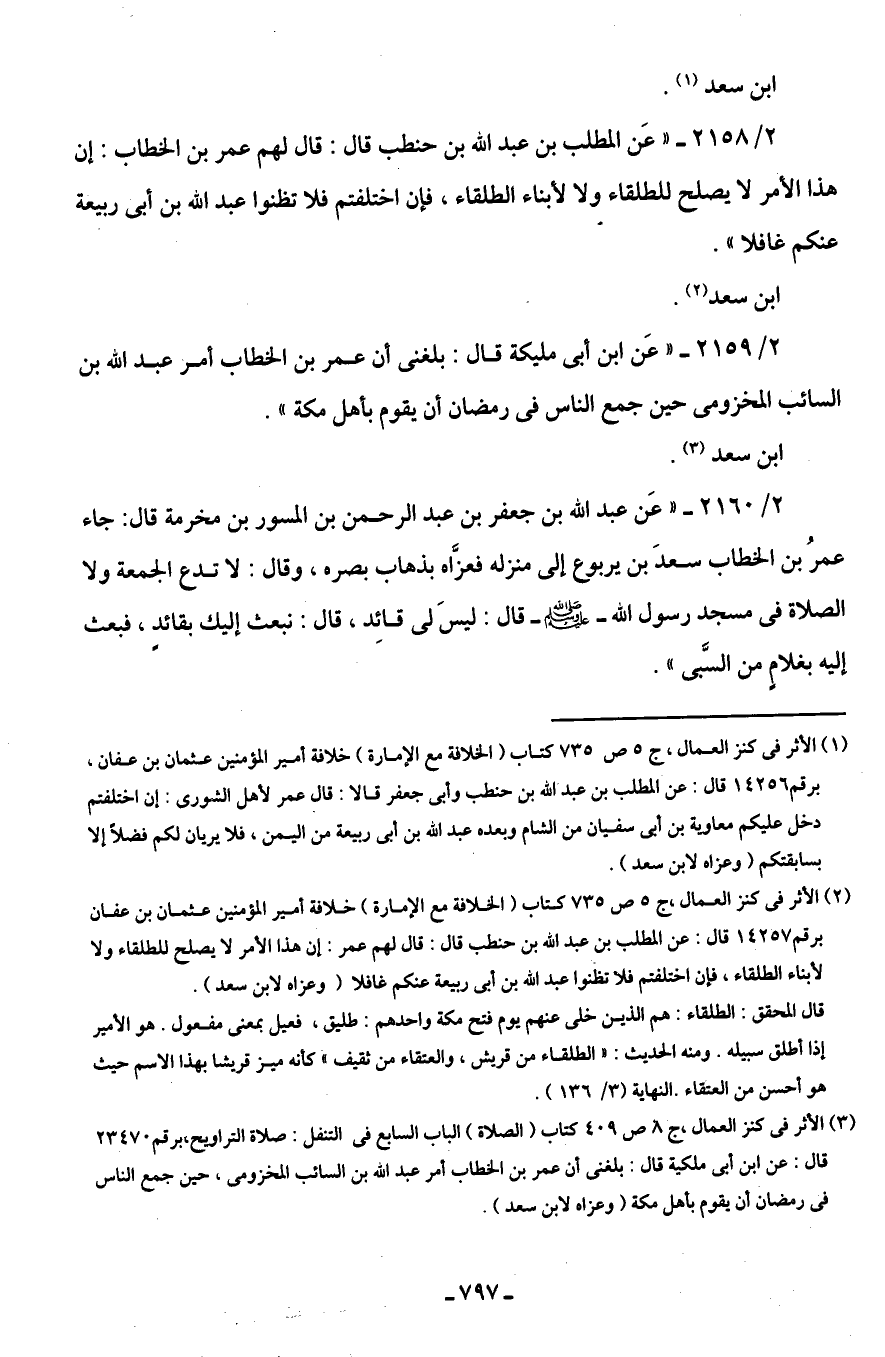2/ 2158 - "عَن المطلب بن عبد اللَّه بن حنطب قال: قال لهم عمر بن الخطاب: إن هذا الأمر لا يصلح للطلقاء ولا لأبناء الطلقاء، فإن اختلفتم فلا تظنوا عبد اللَّه بن أَبى ربيعة عنكم غافلا".