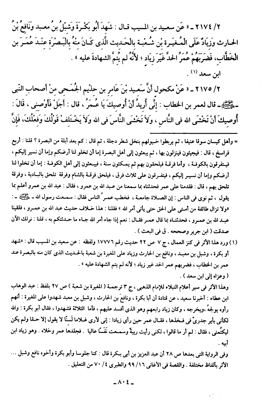 2/ 2174 - "عَن سعيد بن المسيب قال: شَهِدَ أَبُو بَكْرَةَ وَشِبْلُ بنُ معبد وَنَافِعُ بْنُ الحارث وَزِيَادٌ عَلَى المُغيَرة بْنِ شُعْبةِ بِالحَدِيث الَّذِى كَانَ مِنْهُ بِالبَصْرَةِ عِنْدَ عُمَرَ بن الخَطَّابِ، فَضَرَبَهُمْ عُمَرُ الحدَّ غَيْرَ زِيَادٍ؛ لأَنَّهُ لم يُتِمَّ الشهادةَ عليه".