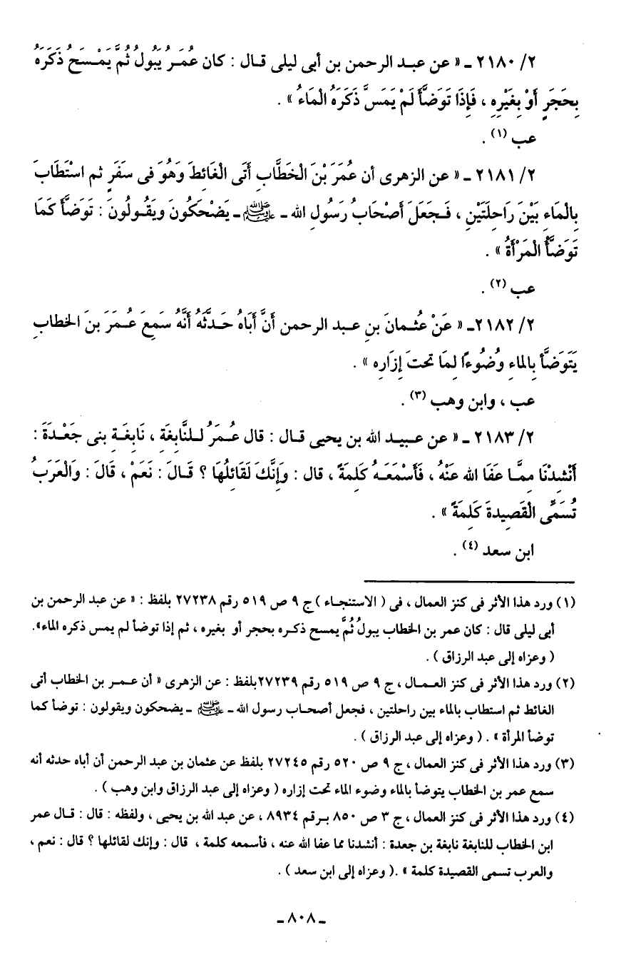(¬1) ورد هذا الأثر في كنز العمال، في (الاستنجاء) جـ 9 ص 519 رقم 27238 بلفظ: "عن عبد الرحمن بن أَبى ليلى قال: كان عمر بن الخطاب يبولُ ثُمَّ يمسح ذكره بحجر أو بغيره، ثم إذا توضأ لم يمس ذكره الماء". (وعزاه إلى عبد الرزاق).