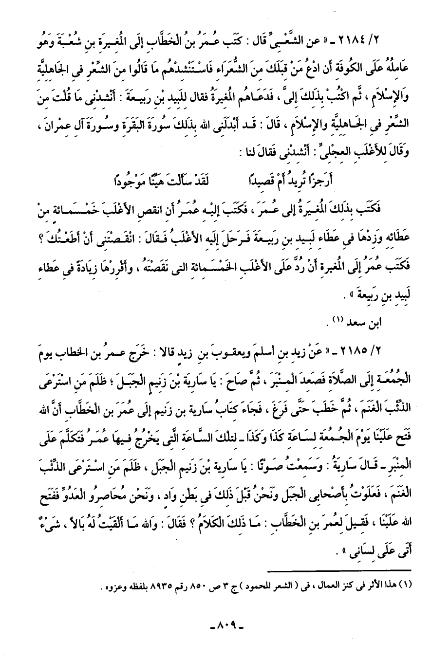 2/ 2184 - "عن الشَّعْبِىِّ قَال: كَتَب عُمَرُ بنُ الخَطَّابِ إلَى المُغِيرَة بنِ شُعْبَةَ وَهُو عَامِلُهُ عَلَى الكُوفَةِ أَن ادْعُ مَنْ قِبَلَكَ مِنَ الشُّعَرَاءِ فَاسْتَنْشِدْهُم مَا قَالُوا مِنَ الشِّعْرِ فِى الجَاهِلِيَّةِ وَالإِسْلَامِ، ثُمَّ اكْتُبْ بِذَلِكَ إِلىَّ، فَدَعَاهُم المُغِيرَةُ فقال لِلَبِيدِ بْنِ رَبيعَةَ: أَنْشِدْنِى مَا قُلْتَ مِنَ الشِّعْرِ فِى الجَاهِلِيَّةِ والإِسْلَامِ، قَالَ: قَد أَبْدَلَنِى اللَّه بِذَلِكَ سُورَةَ البَقَرَةِ وسُورَةَ آلِ عِمْرانَ، وَقَالَ لِلأَغْلَبِ العِجْلِىِّ: أَنْشِدْنِى فَقالَ لنا: