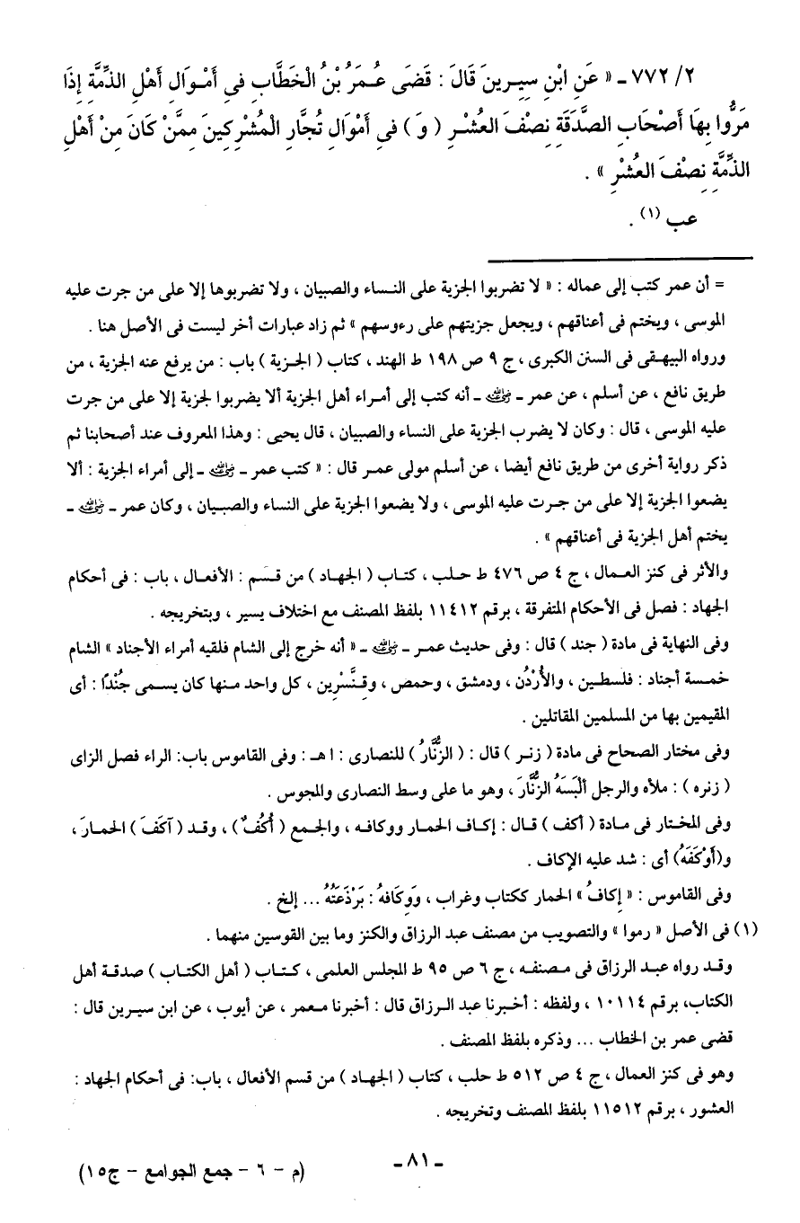 2/ 772 - "عَنِ ابْنِ سِيِرينَ قَالَ: قَضَى عُمَرُ بْنُ الْخَطَّابِ فِى أَمْوَالِ أَهْلِ الذِّمَّةِ إِذَا مَرُّوا بِهَا أَصْحَابِ الصَّدَقَةِ نِصْفَ العُشْرِ (وَ) فِى أَمْوَالِ تُجَّارِ الْمُشْرِكِينَ مِمَّنْ كَانَ مِنْ أَهْلِ الذِّمَّةِ نِصْفَ العُشْرِ".