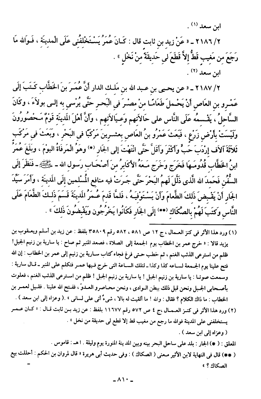 (¬2) ورد هذا الأثر في كنز العمال، جـ 4 ص 572 رقم 11677 بلفظ: عن زيد بن ثابت قال: "كان عمر يستخلفنى على المدينة فواللَّه ما رجع من مغيب قط إلا قطع لى حديقة من نخل".