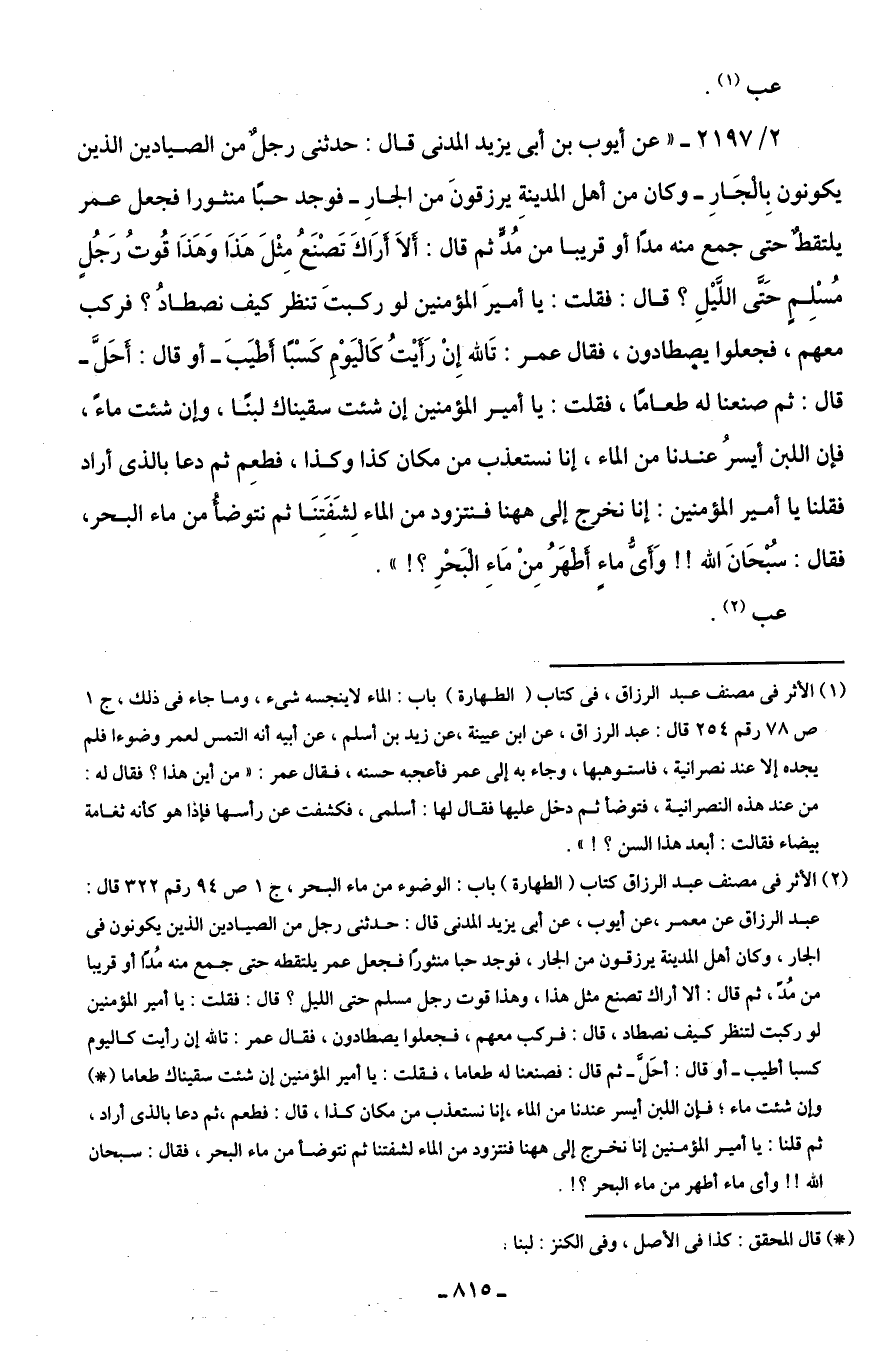 (¬2) الأثر في مصنف عبد الرزاق كتاب (الطهارة) باب: الوضوء من ماء البحر، جـ 1 ص 94 رقم 322 قال: عبد الرزاق عن معمر، عن أيوب، عن أَبى يزيد المدنى قال: حدثنى رجل من الصيادين الذين يكونون في الجار، وكان أهل المدينة يرزقون من الجار، فوجد حبا منثورًا فجعل عمر يلتقطه حتى جمع منه مُدًا أو قريبا من مُدّ، ثم قال: ألا أراك تصنع مثل هذا، وهذا قوت رجل مسلم حتى الليل؟ قال: فقلت: يا أمير المؤمنين لو ركبت لتنظر كيف نصطاد، قال: فركب معهم، فجعلوا يصطادون، فقال عمر: تاللَّه إن رأيت كاليوم كسبا أطيب -أو قال: أحَلَّ- ثم قال: فصنعنا له طعاما، فقلت: يا أمير المؤمنين إن شئت سقيناك طعاما (*) وإن شئت ماء؛ فإن اللبن أيسر عندنا من الماء، إنا نستعذب من مكان كذا، قال: فطعم، ثم دعا بالذى أراد، ثم قلنا: يا أمير المؤمنين إنا نخرج إلى ههنا فنتزود من الماء لشفتنا ثم نتوضأ من ماء البحر، فقال: سبحان اللَّه! ! وأى ماء أطهر من ماء البحر؟ ! .