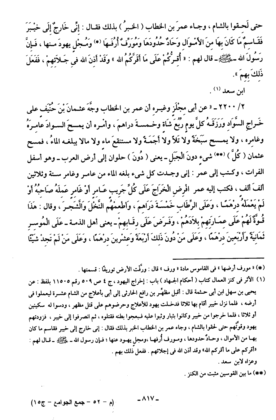 (¬1) الأثر في كنز العمال كتاب (أحكام الجهاد) باب: إخراج اليهود، جـ 4 ص 509 رقم 11505 بلفظ: عن يحيى بن سهل ابن أَبى حثمة قال: أقبل مظهِّر بن رافع الحارثى إلى أَبى بأعلاج من الشام عشرة ليعملوا في أرضه، فلما نزل خيبر أقام بها ثلاثًا فدخلت يهود للأعلاج وحرضوهم على قتل مظهر، ودسوا له سكينين أو ثلاثا، فلما خرجوا من خيبر وكانوا بشار وثبوا عليه فبعجوا بطنه فقتلوه، ثم انصرفوا إلى خيبر، فزودتهم يهود وقوَّتْهم حتى لحقوا بالشام، وجاء عمر بن الخطاب الخبر بذلك فقال: إنى خارج إلى خيبر فقاسم ما كان بها من الأموال، وحادٌ حدودها، ومورف أُرفها، ومجلٍ يهود عنها؛ فإن رسول اللَّه -صلى اللَّه عليه وسلم- قال لهم: "أقركم على ما أقركم اللَّه" وقد أذن اللَّه في إجلائهم. ففعل ذلك بهم.