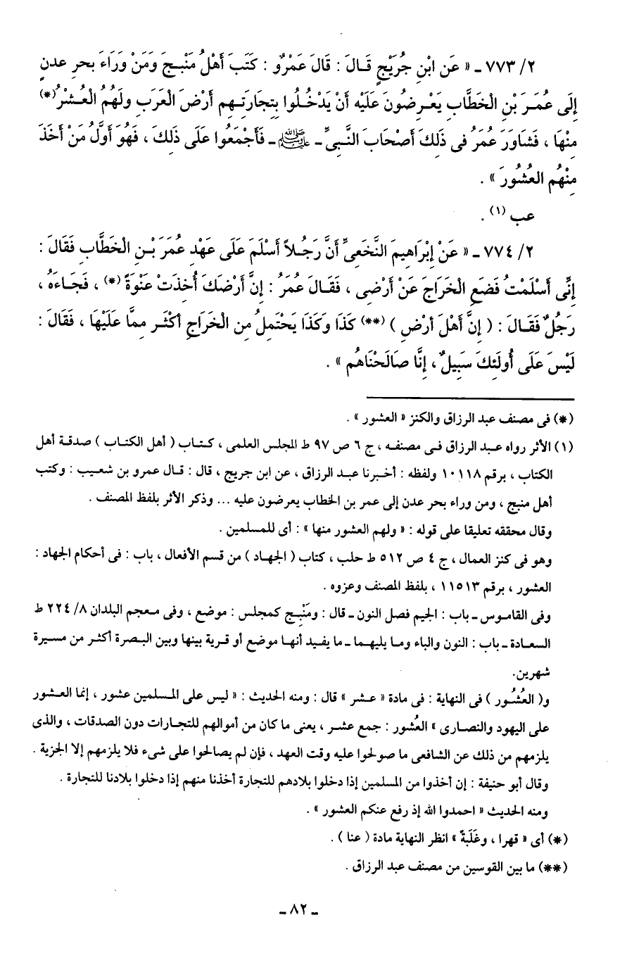 2/ 773 - "عَن ابْنِ جُرَيْجٍ قَالَ: قَالَ عَمْرٌو: كَتَبَ أَهْلُ مَنْبجَ وَمَنْ وَرَاءَ بحرِ عدنٍ إِلَى عُمَرَ بْنِ الْخَطَّابِ يَعْرِضُونَ عَلَيْه أَنْ يَدْخُلُوا بِتِجَارَتِهِم أَرْضَ الْعَرَبِ ولَهُمُ الْعُشْرُ (*) مِنْهَا، فَشَاوَرَ عُمَرُ في ذَلِكَ أَصْحَابَ النَّبِيِّ - صلى الله عليه وسلم - فَأَجْمَعُوا عَلَى ذَلِكَ، فَهُوَ أَوَّلُ مَنْ أَخَذَ مِنْهُم العُشُورَ".