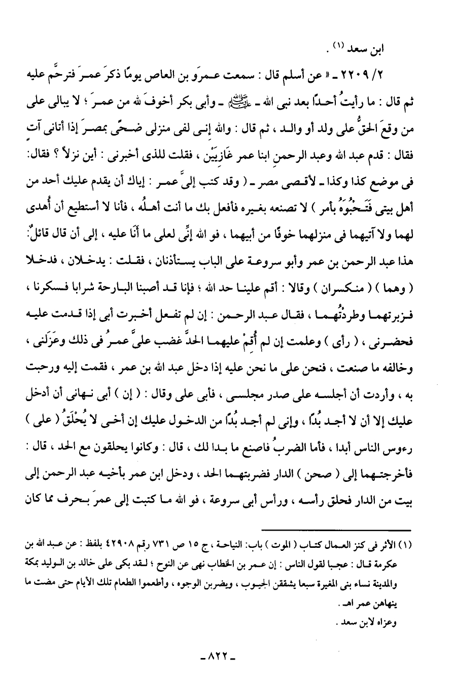 2/ 2209 - "عن أسلم قال: سمعت عمرَو بن العاص يومًا ذكرَ عمرَ فترحَّم عليه ثم قال: ما رأَيتُ أحدًا بعد نبى اللَّه -صلى اللَّه عليه وسلم- وأبى بكر أخوفَ للَّه من عمرَ؛ لا يبالى على من وقعَ الحقُّ على ولد أو والد، ثم قال: واللَّه إِنِّى لفى منزلى ضحًى بمصرَ إذا أتانى آتٍ فقال: قدم عبد اللَّه وعبد الرحمنِ ابنا عمر غَازِيَيْن، فقلت للذى أخبرنى: أين نزلا؟ فقال: في موضع كذا وكذا -لأقصى مصر- (وقد كتب إلىَّ عمر: إياك أن يقدم عليك أحد من أهل بيتى فَتَحْبُوَهُ بأمر) لا تصنعه بغيره فأفعل بك ما أنت أهلُه، فأنا لا أستطيع أن أُهدى لهما ولا آتيهما في منزلهما خوفًا من أبيهما، فواللَّه إنِّى لعلى ما أَنَا عليه، إلى أن قال قائلٌ: هذا عبد الرحمن بن عمر وأَبو سروعة على الباب يستأذنان، فقلت: يدخلان، فدخلا (وهما) (منكسران) وتالا: أقم علينا حد اللَّه؛ فإنا قد أصبنا البارحة شرابا فسكرنا، فزبرتهما وطردْتُهما، فقال عبد الرحمن: إن لم تفعل أخبرت أَبى إذا قدمت عليه فحضرنى، (رأى) وعلمت إن لم أُقِمْ عليهما الحدَّ غضب علىَّ عمرُ في ذلك وعَزَلنى، وخالفه ما صنعت، فنحن على ما نحن عليه إذا دخل عبد اللَّه بن عمر، فقمت إليه ورحبت به، وأردت أن أجلسه على صدر مجلسى، فأبى على وقال: (إن) أَبى نهانى أن أدخل عليك إلا أن لا أجد بُدًا، وإنى لم أجد بُدًا من الدخول عليك إن أخى لا يُحْلَقُ (على) رءوس الناس أبدا، فأما الضربُ فاصنع ما بدا لك، قال: وكانوا يحلقون مع الحد، قال: فأخرجتهما إلى (صحن) الدار فضربتهما الحد، ودخل ابن عمر بأخيه عبد الرحمن إلى بيت من الدار فحلق رأسه، ورأس أَبى سروعة، فواللَّه ما كتبت إلى عمرَ بحرف مما كان