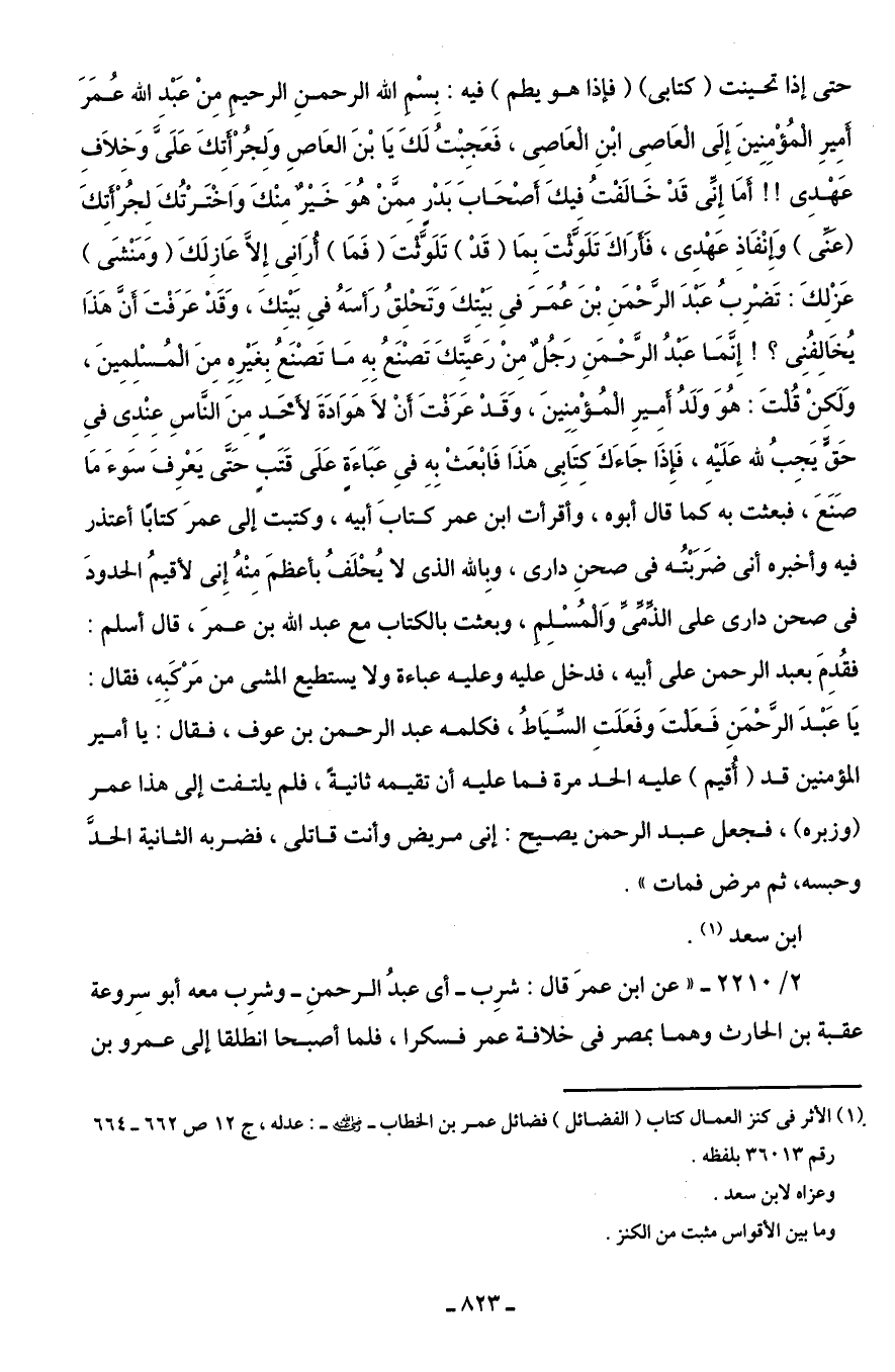 حتى إذا تحينت (كتابى) (فإذا هو يطم) فيه: بِسْمِ اللَّهِ الرَّحْمَنِ الرَّحِيمِ مِنْ عَبْد اللَّه عُمَرَ أَمِيرِ الْمُؤْمِنِينَ إِلَى الْعَاصِى ابْنِ الْعَاصِى، فَعَجِبْتُ لَكَ يَا بْنَ العَاصِ وَلِجُرْأَتِكَ عَلَىَّ وَخِلَافِ عَهْدِى! ! أَمَا إِنِّى قَدْ خَالَفْتُ فِيكَ أَصْحَابَ بَدْر مِمَّنْ هُوَ خَيْرٌ مِنْكَ وَاخْتَرْتُكَ لِجُرْأَتِكَ (عَنِّى) وَإنْفَاذِ عَهْدِى، فَأَرَاكَ تَلَوَّثْتَ بِمَا (قَدْ) تَلَوَّثْتَ (فَمَا) أُرَانِى إِلَّا عَازِلَكَ (وَمَنْشَى) عَزْلِكَ: تَضْرِبُ عَبْدَ الرَّحْمَنِ بْنَ عُمَرَ فِى بَيْتِكَ وَتَحْلِقُ رَأسَهُ فِى بَيْتِكَ، وَقَدْ عَرَفْتَ أَنَّ هَذَا يُخَالِفُنِى؟ ! إِنَّمَا عَبْدُ الرَّحْمَنِ رَجُلٌ مِنْ رَعيَّتِكَ تَصْنَعُ بِهِ مَا تَصْنَعُ بِغَيْر مِنَ المُسْلِمِينَ، وَلَكِنْ قُلْتَ: هُوَ وَلَدُ أَمِيرِ الْمُؤْمِنِينَ، وَقَدْ عَرَفْتَ أَنْ لَا هَوَادَةَ لأَحَدٍ مِنَ النَّاسِ عِنْدِى فِى حَقٍّ يَجِبُ للَّه عَلَيْهِ، فَإِذَا جَاءَكَ كِتَابِى هَذَا فَابْعَثْ بِهِ فِى عَبَاءَةٍ عَلَى قَتَبٍ حَتَّى يَعْرِفَ سَوءَ مَا صَنَعَ، فبعثت به كما قال أبوه، وأقرأت ابن عمر كتابَ أبيه، وكتبت إلى عمرَ كتابًا أعتذر فيه وأخبره أنى ضَرَبْتُه في صحنِ دارى، وبِاللَّه الذى لا يُحْلَفُ بأعظمَ مِنْهُ إِنِّى لأقيمُ الحدودَ في صحن دارى على الذِّمِّىِّ وَالْمُسْلِمِ، وبعثت بالكتاب مع عبد اللَّه بن عمرَ، قال أسلم: فقُدِمَ بعبد الرحمن على أبيه، فدخل عليه وعليه عباءة ولا يستطيع المشى من مَرْكَبِهِ، فقال: يَا عَبْدَ الرَّحْمَنِ فَعَلتَ وفَعَلَتِ السِّيَاطُ، فكلمه عبد الرحمن بن عوف، فقال: يا أمير المؤمنين قد (أقيم) عليه الحد مرة فما عليه أن تقيمه ثانيةً، فلم يلتفت إلى هذا عمر (وزبره)، فجعل عبد الرحمن يصيح: إنى مريض وأنت قاتلى، فضربه الثانية الحدَّ وحبسه، ثم مرض فمات".