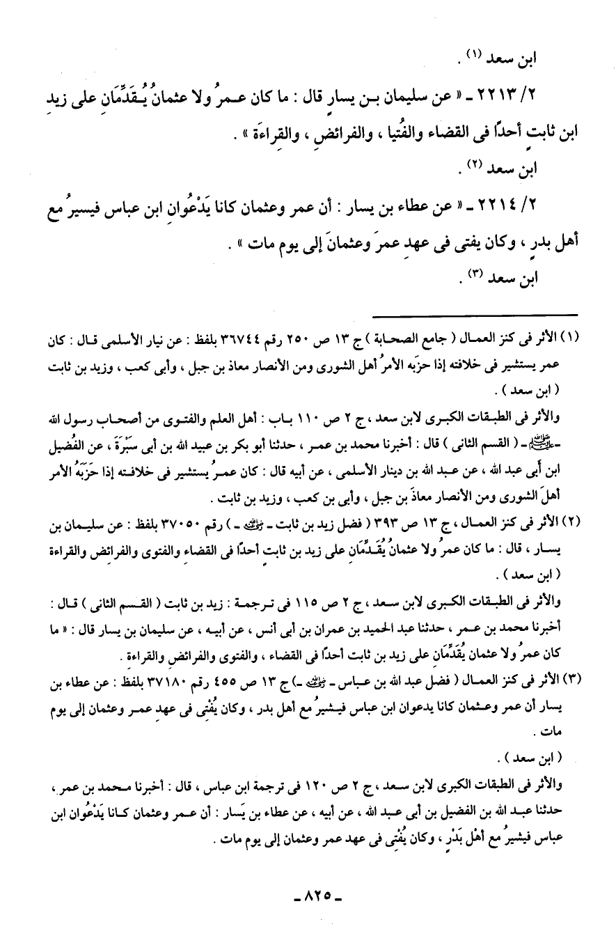(¬2) الأثر في كنز العمال، جـ 13 ص 393 (فضل زيد بن ثابت -رضي اللَّه عنه-) رقم 37050 بلفظ: عن سليمان بن يسار، قال: ما كان عمرُ ولا عثمانُ يُقَدِّمَان على زيد بن ثابتٍ أحدًا في القضاء والفتوى والفرائِض والقراءة (ابن سعد).