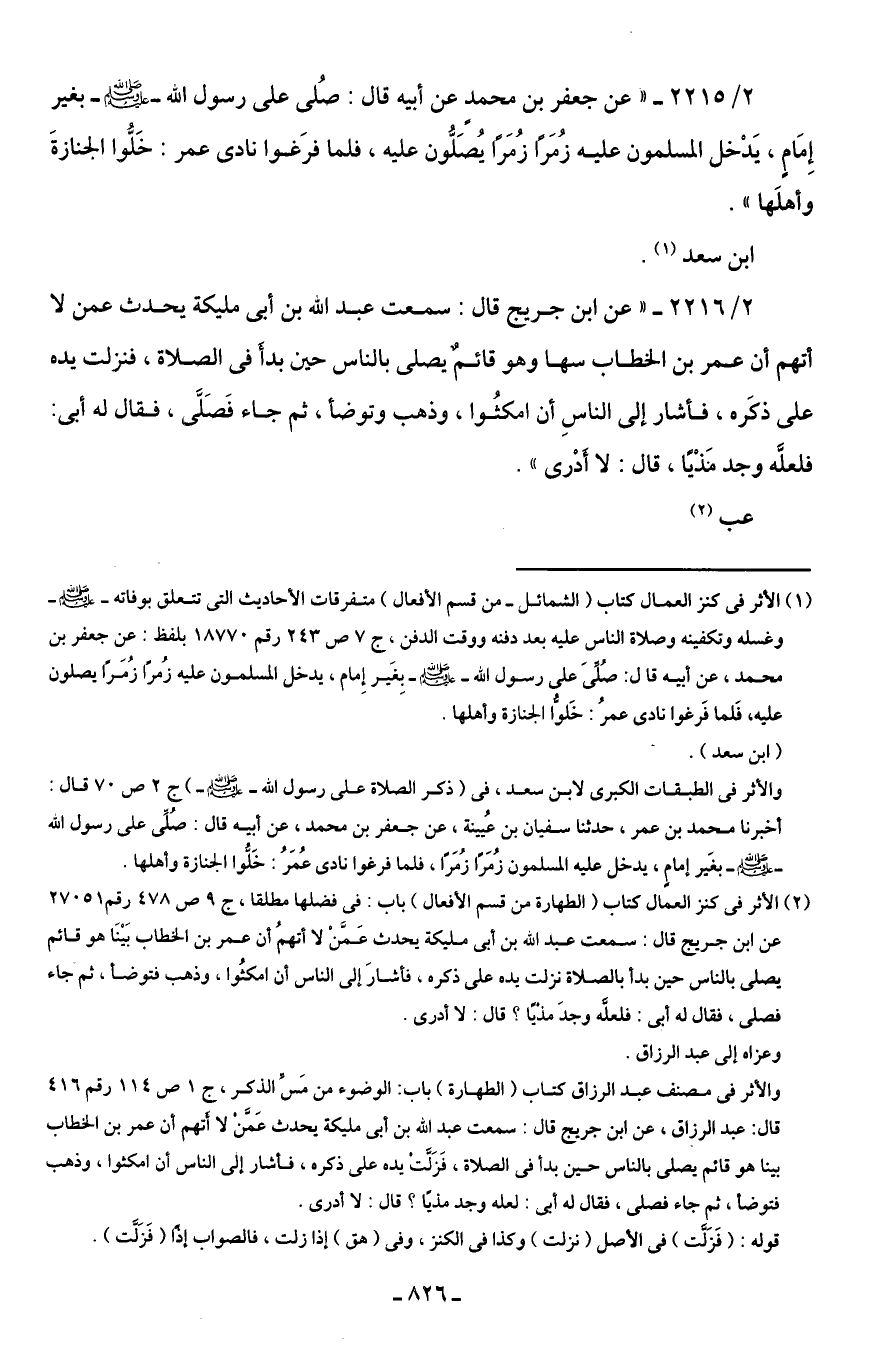 (¬1) الأثر في كنز العمال كتاب (الشمائل - من قسم الأفعال) متفرقات الأحاديث التى تتعلق بوفاته -صلى اللَّه عليه وسلم- وغسله وتكفينه وصلاة الناس عليه بعد دفنه ووقت الدفن، جـ 7 ص 243 رقم 18770 بلفظ: عن جعفر بن محمد، عن أبيه قال: صُلِّىَ على رسول اللَّه -صلى اللَّه عليه وسلم- بغَير إِمام، يدخل المسلمون عليه زُمرًا زُمَرًا يصلون عليه، فَلما فَرغوا نادى عمرُ: خَلوُّا الجنازة وأهلها.