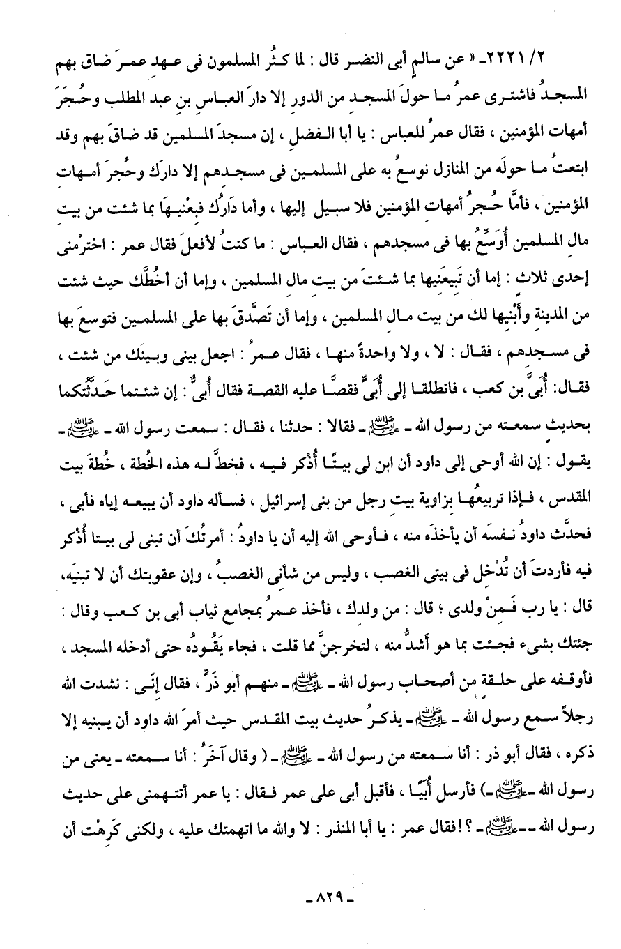 2/ 2221 - "عن سالمٍ أَبى النضر قال: لما كثُر المسلمون في عهدِ عمرَ ضاق بهم المسجدُ فاشترى عمرُ ما حولَ المسجدِ من الدورِ إلا دارَ العباسِ بنِ عبد المطلب وحُجَرَ أمهات المؤمنين، فقال عمرُ للعباس: يا أبا الفضلِ، إن مسجدَ المسلمين قد ضاقَ بهم وقد ابتعتُ ما حولَه من المنازل نوسعُ به على المسلمين في مسجدِهم إلا دارَك وحُجرَ أمهاتِ المؤمنين، فأمَّا حُجرُ أمهاتِ المؤمنين فلا سبيل إليها، وأما دَارُك فبِعْنيهَا بما شئت من بيتِ مالِ المسلمين أوَسِّعُ بها في مسجدهم، فقال العباس: ما كُنْتُ لأفعلَ فقال عمر: اخترْمنى إحدى ثلاثٍ: إما أن تَبِيعَنِيها بما شئتَ من بيتِ مالِ المسلمين، وإما أن أخُطَّك حيث شئت من المدينةِ وأَبْنيِها لك من بيت مالِ المسلمين، وإما أن تَصَّدقَ بها على المسلمين فتوسعَ بها في مسجدِهم، فقال: لا، ولا واحدةً منها، فقال عمرُ: اجعل بينى وبينَك من شئت، فقال: أُبَىّ بن كعب، فانطلقا إلى أُبَىٍّ فقصَّا عليه القصة فقال أَبىّ: إن شئتما حَدَّثُتكما بحديثٍ سمعته من رسول اللَّه -صلى اللَّه عليه وسلم- فقالا: حدثنا، فقال: سمعت رسول اللَّه -صلى اللَّه عليه وسلم- يقول: إن اللَّه أوحى إلى داود أن ابن لى بيتًا أُذْكر فيه، فخط له هذه الخُطة، خُطةَ بيت المقدس، فإذا تربيعُها بِزاوية بيتِ رجل من بنى إسرائيل، فسأله داود أن يبيعه إياه فأبى، فحدَّث داودُ نفسَه أن يأخذَه منه، فأوحى اللَّه إليه أن يا داودُ: أمرتُكَ أن تبنى لى بيتا أُذْكر فيه فأردتَ أن تُدْخِل في بيتى الغصب، وليس من شأنِى الغصبُ، وإن عقوبتك أن لا تبنيَه، قال: يا رب فَمِنْ ولدى؛ قال: من ولدِك، فأخذ عمرُ بمجامع ثياب أُبى بن كعب وقال: جئتك بشئ فجئت بما هو أَشدُّ منه، لتخرجنَّ مما قلت، فجاء يَقُودُه حتى أدخله المسجد، فأوقفه على حلقة من أصحاب رسول اللَّه -صلى اللَّه عليه وسلم- منهم أبو ذَرٍّ، فقال إِنِّى: نشدت اللَّه رجلًا سمع رسول اللَّه -صلى اللَّه عليه وسلم- يذكرُ حديث بيت المقدس حيث أمرَ اللَّه داود أن يبنيه إلا ذكره، فقال أبو ذر: أنا سمعته من رسول اللَّه -صلى اللَّه عليه وسلم- (وقال آخَرُ: أنا سمعته -يعنى من رسول اللَّه -صلى اللَّه عليه وسلم-) فأرسل أُبَيًا، فأقبل أَبى على عمر فقال: يا عمر أتتهمنى على حديث رسول اللَّه -صلى اللَّه عليه وسلم-؟ ! فقال عمر: يا أبا المنذر: لا واللَّه ما اتهمتك عليه، ولكنى كَرِهْت أن