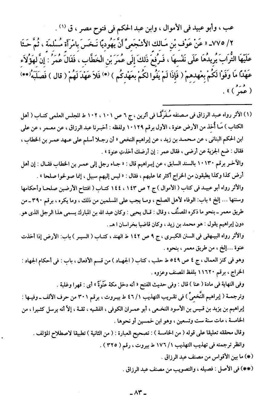 (¬1) الأثر رواه عبد الرزاق في مصنفه مُفَرَّقًا في أثرين، ج 6 ص 101، 102 ط المجلس العلمى كتاب (أهل الكتاب) مَا أُخِذ من الأرض عنوة، الأول برقم 10129 ولفظه: أخبرنا عبد الرزاق، عن معمر، عن على بن الحكم البنانى، عن محمد بن زيد، عن إبراهيم النخعى "أن رجلًا أسلم على عهد عمر بن الخطاب، فقال: ضع الجزية عن أرضى، فقال عمر: إن أرضك أخذت عنوة".