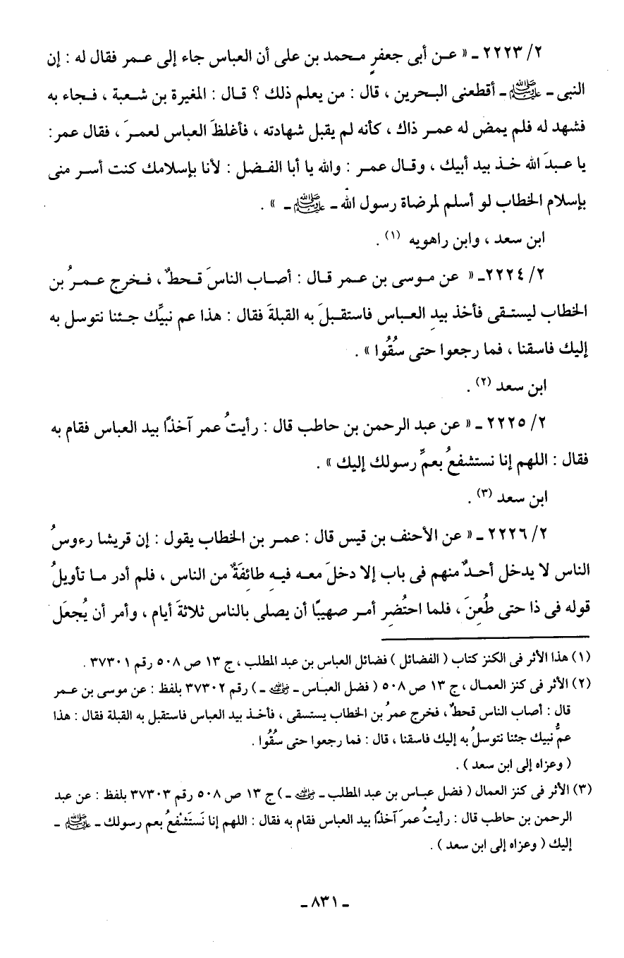 (¬3) الأثر في كنز العمال (فضل عباس بن عبد المطلب -رضي اللَّه عنه-) جـ 13 ص 508 رقم 37303 بلفظ: عن عبد الرحمن بن حاطب قال: رأَيتُ عمرَ آخذًا ببد العباس فقام به فقال: اللهم إنا نَستَشْفعُ بعم رسولك -صلى اللَّه عليه وسلم- إليك (وعزاه إلى ابن سعد).