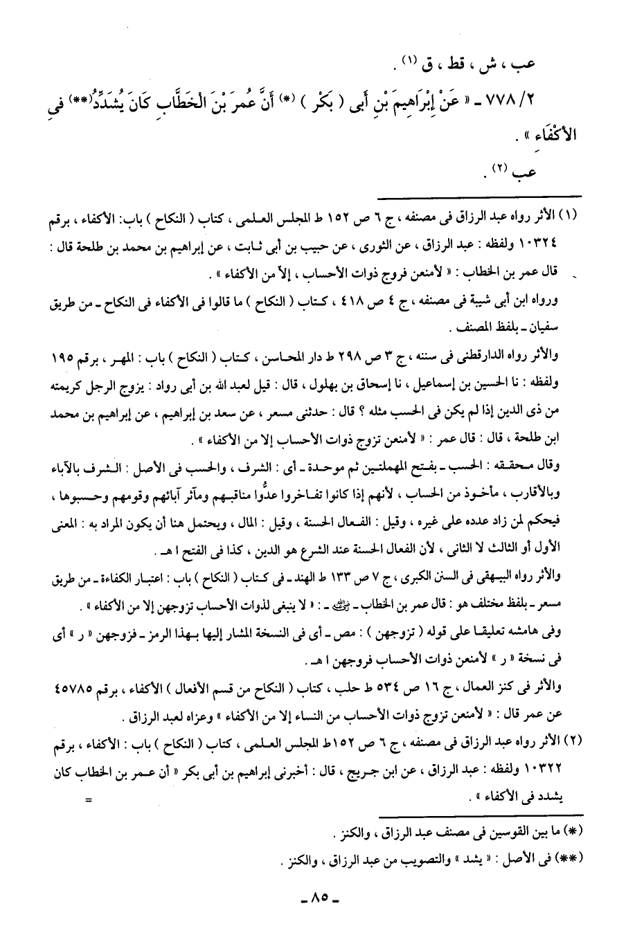 2/ 778 - "عَنْ إِبْرَاهِيمَ بْنِ أَبى (بَكْر) (*) أَنَّ عُمَر بْنَ الْخَطَّابِ كَانَ يُشَدِّدُ (* *) فِى الأَكْفَاءِ".