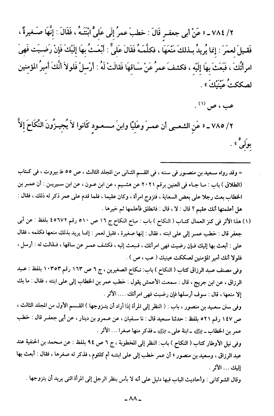 (¬1) هذا الأثر في كنز العمال كتاب (النكاح) باب: مباح النكاح ج 16 ص 510 رقم 45672 بلفظ: عن أبى جعفر قال: خطب عمر إلى على ابنته، فقال: إنها صغيرة، فقيل لعمر: إنما يريد بذلك منعها فكلمه، فقال على: أبعث بها إليك فإن رضيت فهى امرأتك، فبعث إليه، فكشف عمر عن ساقها، فقالت له: أرسل، فلولا أنك أمير المؤمنين لصككت عينيك (عب، ص).