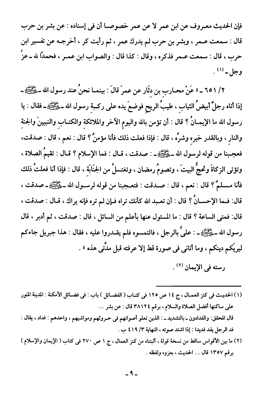 2/ 651 - "عَنْ محاربِ بن دِثَار عن عمرَ قالَ: بينما نحنُ عند رسول الله - صلى الله عليه وسلم - إذا أتاه رجلٌ أبيضُ الثيابِ، طيبُ الريحِ فوضعَ يده على ركبةِ رسول الله - صلى الله عليه وسلم - فقال: يا رسول الله ما الإيمانُ؟ قال: أن تؤمن بالله واليومِ الآخر والملائكةِ والكتابِ والنبيينَ والجنةِ والنارِ، وبالقدر خيرهِ وشرَّه، قال: فإذا فعلت ذلك فأنا مؤمنٌ؟ قال: نعم، قال: صدقت، فعجبنا من قوله لرسول الله - صلى الله عليه وسلم -: صدقت، قال: فما الإسلام؟ قال: تقيمُ الصلاة، وتؤتى الزكاةَ وتحجُّ البيتَ، وتصومُ رمضان، وتغتسل من الجنَابَةِ، قال: فإذا أنا فعلتُ ذلك فأنا مسلمٌ؟ قال: نعم، قال: صدقت: فتعجبنا من قوله لرسول الله - صلى الله عليه وسلم - صدقت، قال: فما الإحسانُ؟ قال: أن تعبد الله كأنك تراه فإن لم تره فإنه يراك، قال: صدقت، قال: فمتى الساعة؟ قال: ما المسئول عنها بأعلم من السائل، قال: صدقت، ثم أدبر، قال رسول الله - صلى الله عليه وسلم -: علىَّ بالرجل، فالتمسوه فلم يقدروا عليه، فقال: هذا جبريل جاءكم ليريَكم دينكم، وما أتانى في صورة قط إلا عرفته قبل مدَّتى هذه".