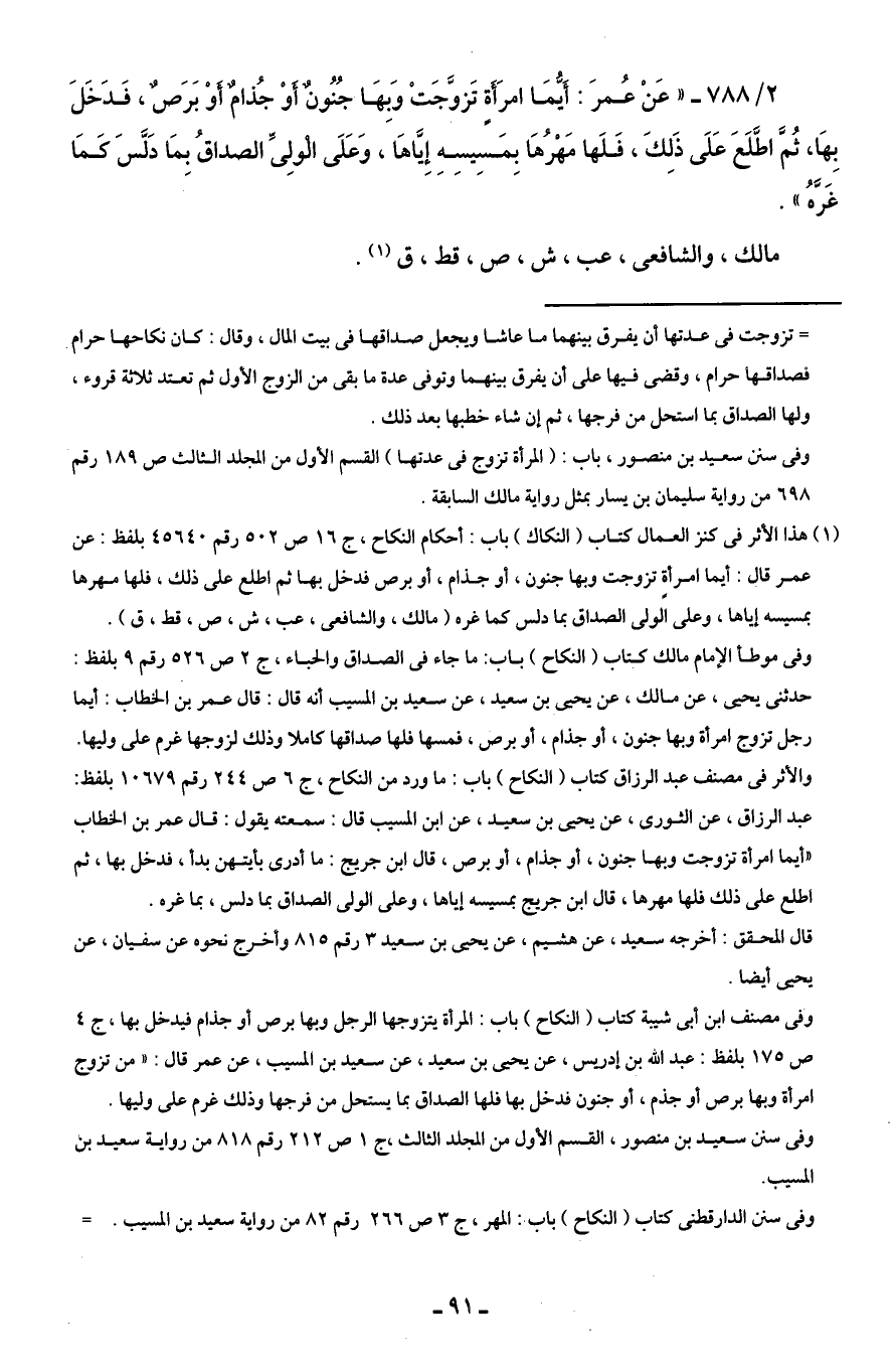 2/ 788 - "عَنْ عُمرَ: أَيُّمَا امرَأَةٍ تَزوَّجَتْ وَبِهَا جُنُونٌ أَوْ جُذامٌ أَوْ بَرَصٌ، فَدَخَلَ بِهَا، ثُمَّ اطَّلَعَ عَلَى ذَلِكَ، فَلَها مَهْرُهَا بِمَسِيسِهِ إِيَّاهَا، وَعَلَى الْولِىِّ الصداقُ بِمَا دَلَّسَ كَمَا غَرَّهُ".