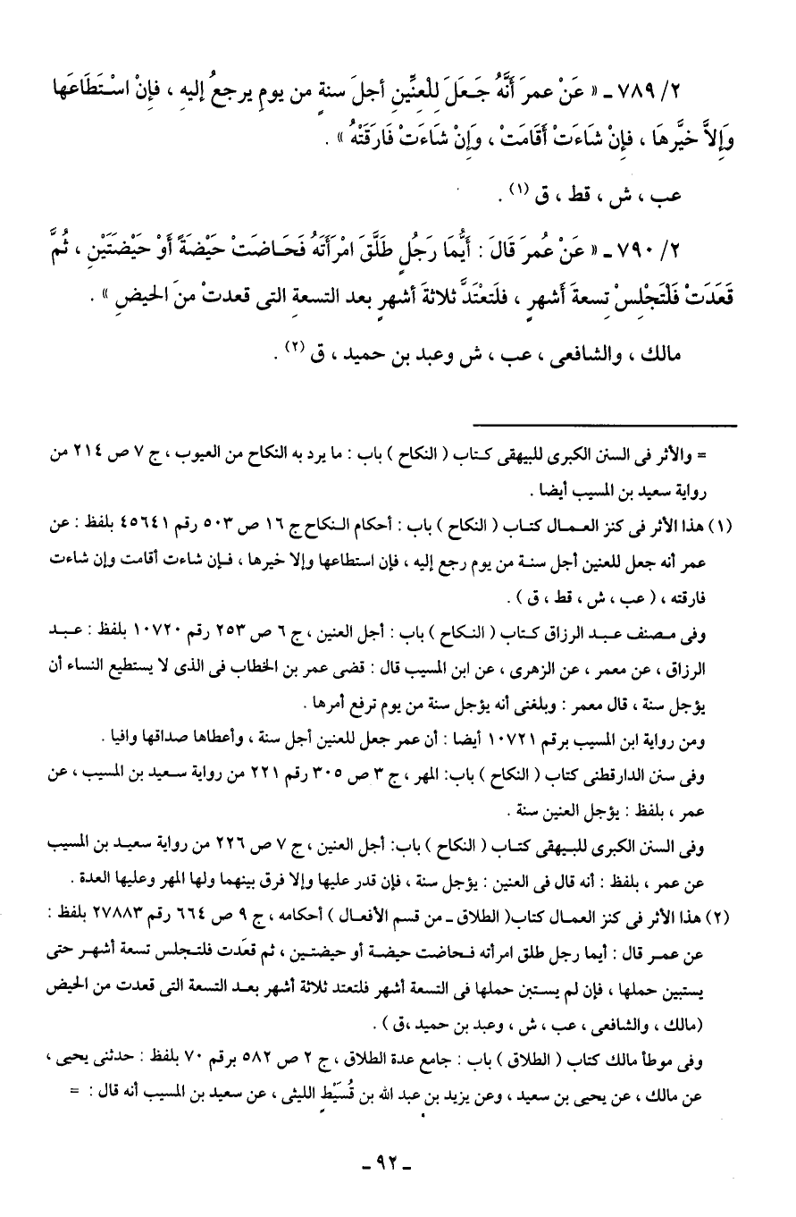 2/ 790 - "عَنْ عُمرَ قَالَ: أَيُّمَا رَجُلٍ طَلَّقَ امْرَأَتَهُ فَحَاضَتْ حَيْضَةً أَوْ حَيْضَتَيْنِ، ثُمَّ قَعَدَتْ فَلْتَجْلِسْ تِسعةَ أَشْهرٍ، فلَتعْتَدَّ ثلاثةَ أشهرٍ بعد التسعةِ التى قعدتْ منَ الحيضِ".