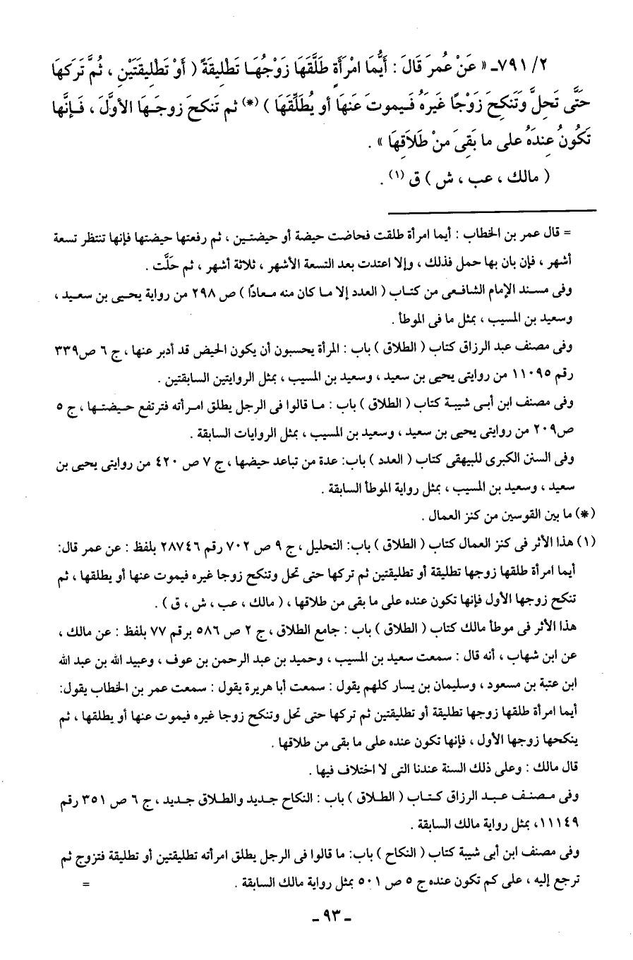 2/ 791 - "عَنْ عُمرَ قَالَ: أَيُّمَا امْرَأَةٍ طَلَّقَهَا زَوْجُهَا تَطْلِيقَةً (أَوْ تَطْلِيقَتَيْنِ، ثُمَّ تَرَكهَا حَتَّى تَحِلَّ وَتَنكِحَ زَوْجًا غَيرَهُ فَيموتَ عَنهَا أو يُطَلِّقَهَا) (*) ثم تَنكحَ زوجَهَا الأوَّلَ، فَإنَّها تَكُونُ عِندَهُ على ما بَقِىَ منْ طَلَاقِهَا".
