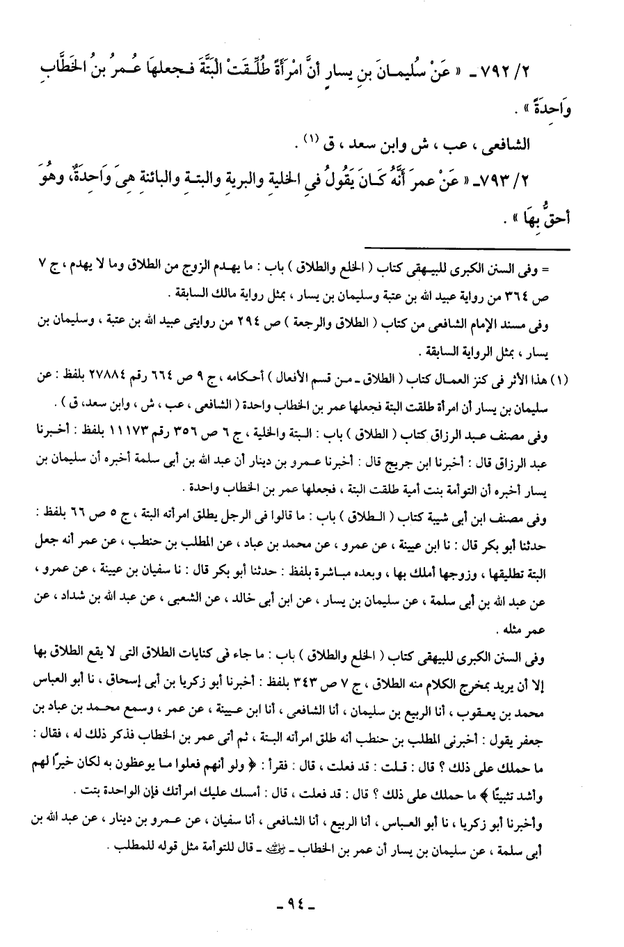 2/ 793 - "عَنْ عمرَ أَنَّهُ كَانَ يَقُولُ فِى الخليةِ والبريةِ والبتةِ والبائنةِ هِىَ وَاحِدَةٌ، وهُوَ أحقُّ بِهَا".