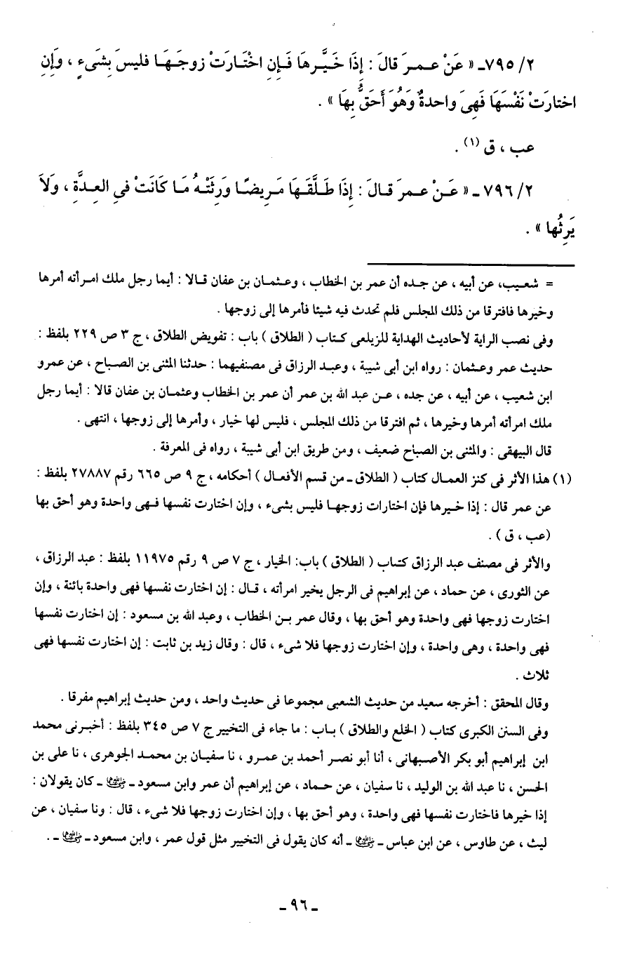 2/ 795 - "عَنْ عمرَ قالَ: إِذَا خَيَّرهَا فَإِنِ اخْتَارَتْ زوجَهَا فليسَ بِشَئٍ، وَإِنِ اختارَتْ نَفْسَهَا فَهِىَ واحدةٌ وَهُوَ أحَقُّ بِهَا".