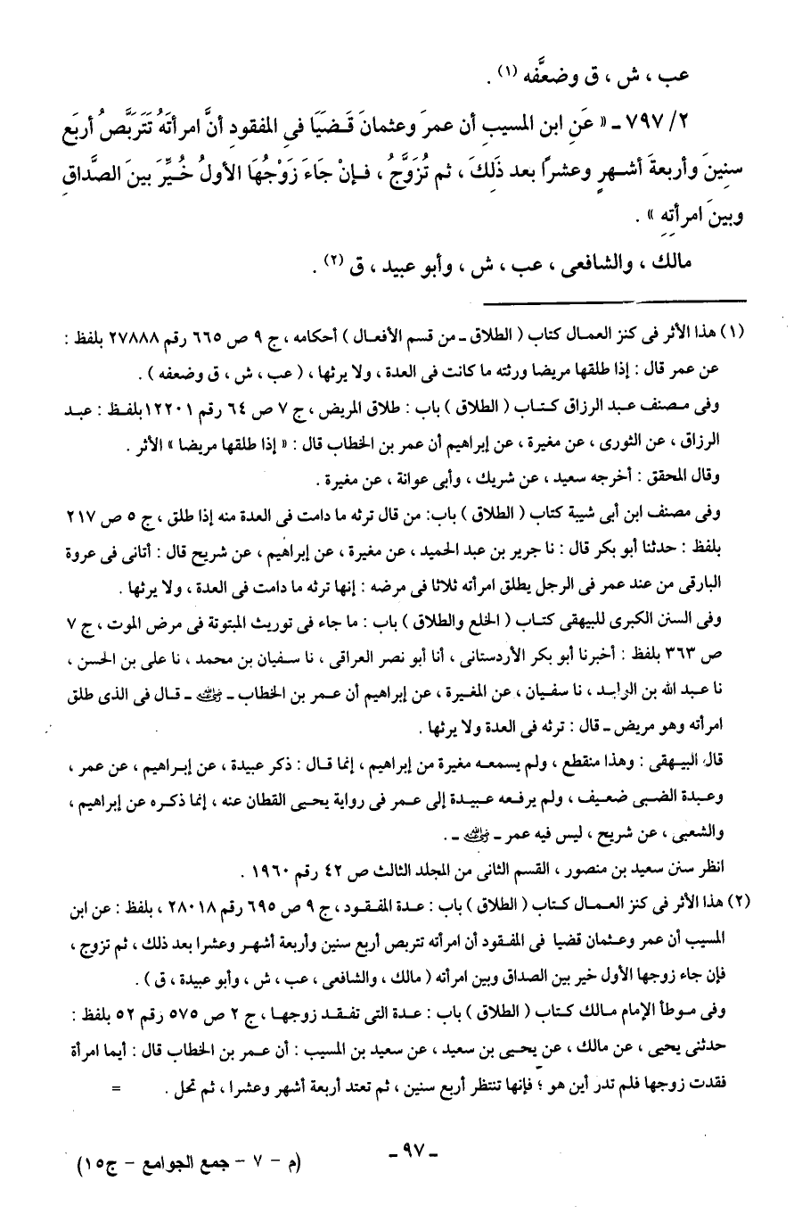 2/ 797 - "عَنِ ابن المسيبِ أن عمرَ وعثمانَ قَضَيَا فِى المفقودِ أنَّ امرأتَهُ تَتَرَبَّصُ أربَع سنِينَ وأربعةَ أشهرٍ وعشرًا بعد ذَلِكَ، ثم تُزَوَّجُ، فإنْ جَاءَ زَوْجُهَا الأولُ خُيَّرَ بينَ الصَّداقِ وبينَ امرأتِهِ".
