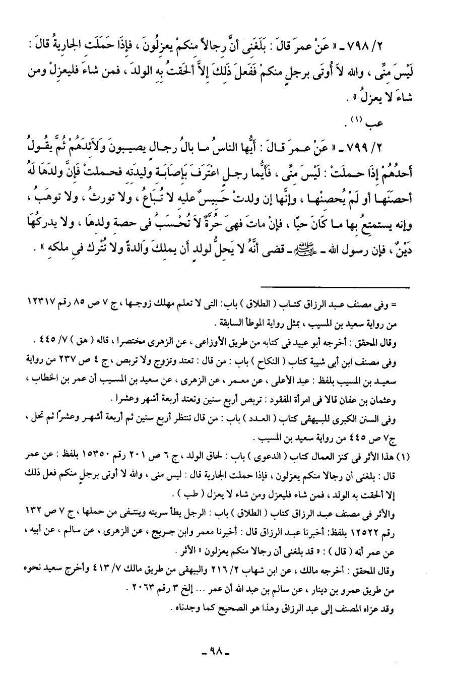 2/ 798 - "عَنْ عمرَ قالَ: بَلَغَنِى أنَّ رِجالًا مِنكمْ يعزِلُونَ، فإِذَا حَمَلَتِ الجارِيةُ قالَ: لَيْسَ مِنَّى، والله لَا أُوتَى برجلٍ منكمْ فَفَعلَ ذَلِكَ إِلَّا ألحَقتُ بِهِ الولدَ، فمن شاءَ فليعزِلْ ومن شاءَ لا يعزلُ".