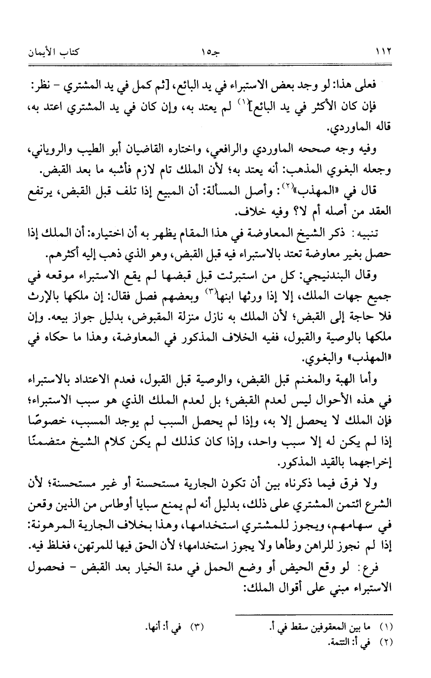 وقال البندنيجي: كل من استبرئت قبل قبضها لم يقع الاستبراء موقعه في جميع جهات الملك، إلا إذا ورثها ابنها وبعضهم فصل فقال: إن ملكها بالإرث فلا حاجة إلى القبض؛ لأن الملك به نازل منزلة المقبوض، بدليل جواز بيعه. وإن ملكها بالوصية والقبول، ففيه الخلاف المذكور في المعاوضة، وهذا ما حكاه في "المهذب" والبغوي.